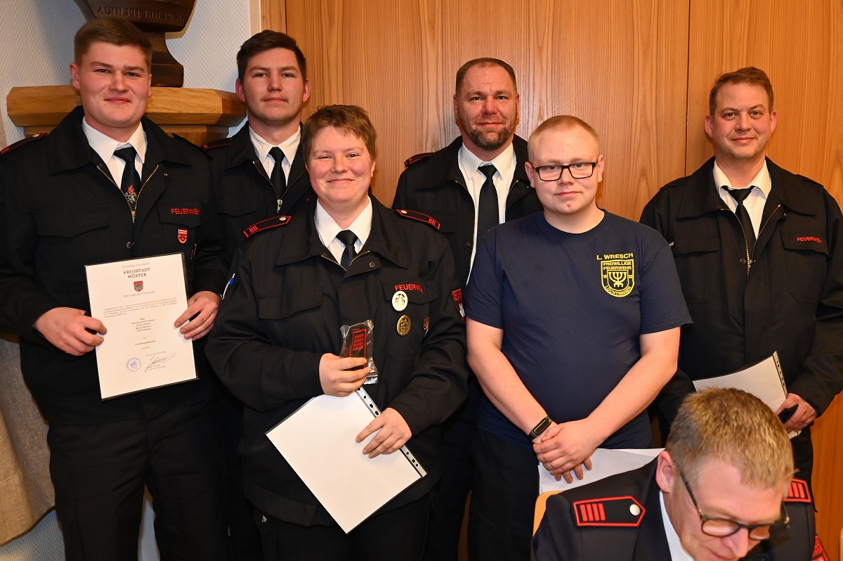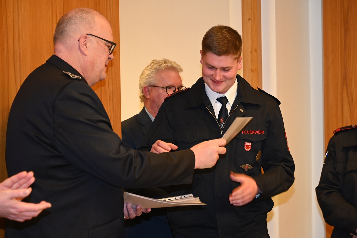 Auch Beförderungen standen auf der Tagesordnung. Zu Unterbrandmeistern wurden Anna Lena Becher, Benjamin Leiße und Noah Hesse befördert. Zum Oberfeuerwehrmann wurden Frederik Hamelmann und Carsten Olandt ernannt. Ingo Wittkowski und Leon Wresche erhielten die Ernennung zum Feuerwehrmann. Für die 30. erfolgreiche Teilnahme an Leistungswettkämpfen wurde Wolfgang Oppermann mit dem Leistungsabzeichen in Gold mit der Zahl 30 ausgezeichnet. Das silberne Leistungsabzeichen erhielt Anna Lena Becher.