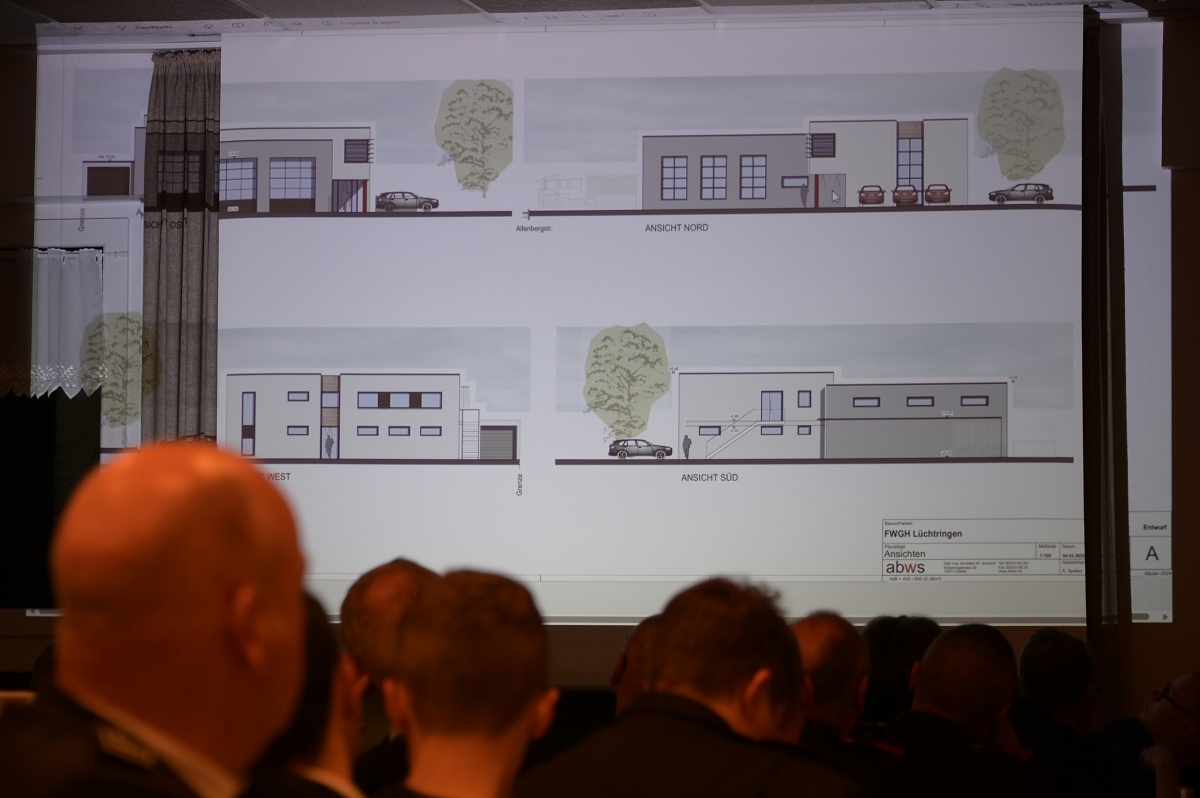 Ausführlich informierten die Verantwortlichen über den aktuellen Stand des Neubaus des Feuerwehrgerätehauses. Aufgrund der kalten Witterung sind die Bauarbeiten derzeit eingeschränkt. Während die Fundamente bereits gegossen wurden, konnte die Bodenplatte bislang noch nicht hergestellt werden. Erstmals wurden den Mitgliedern die Baupläne per Beamer vorgestellt. Vorgesehen sind vier Fahrzeughallen für drei Einsatzfahrzeuge sowie ein Feuerwehrboot. Das Gebäude wird nach modernen Standards errichtet und erhält einen Aufzug. Damit entsteht das erste Feuerwehrgerätehaus im Stadtgebiet Höxter mit einem eigenen Aufzug. Das bisherige Gerätehaus sowie das rund 120 Jahre alte ehemalige Schulgebäude wurden bereits abgerissen.