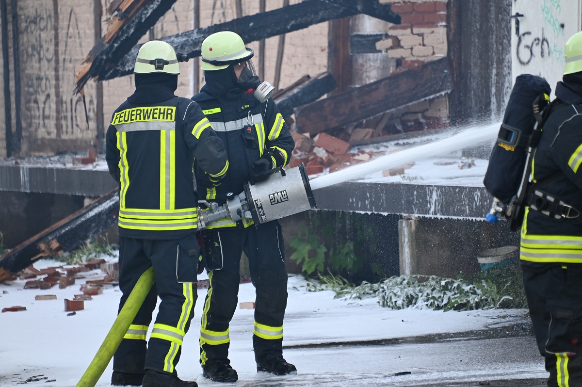 Das betroffene Lagergebäude brannte vollständig aus. Ein Innenangriff war aus Sicherheitsgründen nicht mehr möglich, sodass die Feuerwehr von außen löschte und auch Schaum einsetzte.