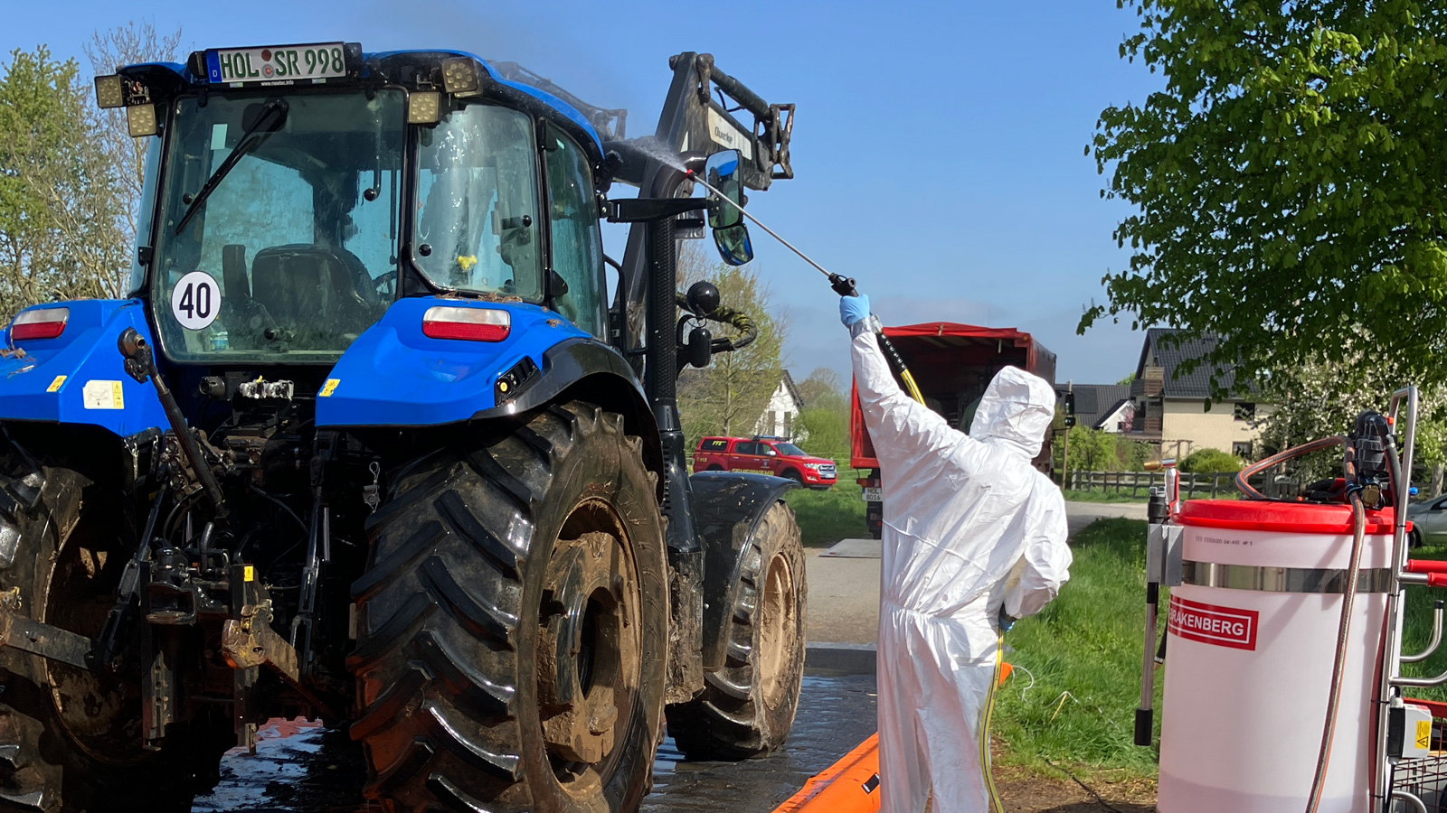 Die Einsatzkräfte des ABC-Zuges unter Leitung von Zugführer Stephan Brandt bauten im Zufahrtsbereich des Betriebes die Fahrzeugschleuse auf. Diese dient dazu, Fahrzeuge beim Verlassen von Restriktionszonen gründlich zu reinigen und zu desinfizieren, um eine Weiterverbreitung von Erregern zu verhindern.
