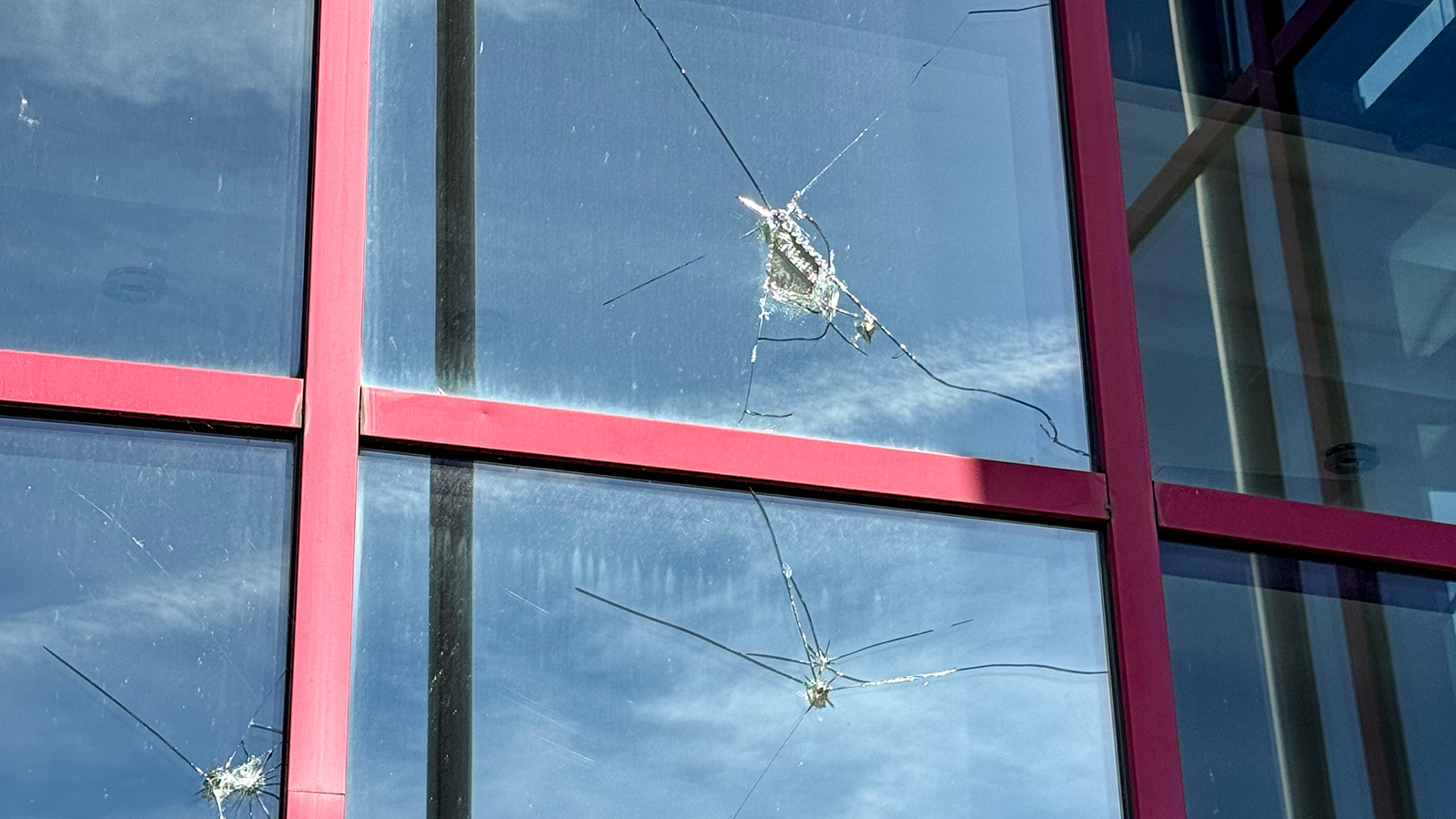 Mehrere runde Einschlaglöcher an der Glasfassade sprechen für ein gezieltes Vorgehen und schließen einen Zufall nahezu aus. Entdeckt wurden die Schäden an der Frontseite des Veranstaltungszentrums am Ostermontag.