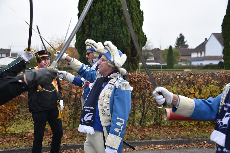 Beverungen-Lauenförde (TKu). Am „Elften im Elften“ um genau 11:11 Uhr hat die fünfte Jahreszeit auch in den Kreisen Höxter und Holzminden wieder begonnen. Kreis- und Länderübergreifend hat der Carnevalsvirus das üble Corona-Virus schon jetzt übertrumpft, wovon man sich in Lauenförde ein Bild machen konnte. Der Schützenverein Lauenförde von 1882 e.V. hatte wieder groß aufgefahren und der Vorsitzende des Schützenvereins, Werner Tyrasa, spuckte wieder einmal große Töne, um das „Rote Rathaus“ vor den Närrinnen und Narren des Carnevalsvereins Weserbrücke e.V. (CVWB) zu verteidigen. Eine große Kanone mit lautem „BUMMS“, eine kleine Armee mit Gewehren, ein Schlagbaum sowie ein großes Banner mit der Aufschrift „Gesperrt“ sollte den Einmarsch der Carnevalisten verhindern. Ein aufgestellter Container sollte außerdem dafür dienen, die Närrinnen und Narren mittels Containerlösung zu „entsorgen“, wie Werner Tyrasa gegenüber CVWB-Präsident Friedhelm Dierkes betonte, als sie sich gegenüber standen. Während der Diskussionen zur Übernahme des Rathauses zwischen den Vereinen wurde der Impfstatus mittels Ouzo auf beiden Seiten immer wieder aufgefrischt. Aber auch trotz absoluter Hingabe des Schüttenhoff Bataillons durchbrach ausgerechnet die Alte Garde vom CVWB den Schlagbaum und nutzte diesen auch noch als Rammbock gegen die Schützen selbst, um das Rathaus zu erstürmen. Die Närrinnen und Narren ergatterten den Rathausschlüssel wie in jedem Jahr von Samtgemeindebürgermeister Tino Wenkel, der sich das ganze Spektakel gemeinsam mit seinen Amtskollegen Hubertus Grimm aus Beverungen und Christian Belke aus Holzminden ansah. Erstmals beim Rathaussturm mit von der Partie war auch die frisch ins Amt gewählte neue Sitzungspräsidentin Emily Buxton, die alle Anwesenden gemeinsam mit Präsident Friedhelm Dierkes begrüßte. Für die Bürgermeister gab es an dieser Stelle jedoch nur den „Corona-Orden“, weil der aktuelle Sessionsorden erst bei der übernächsten Veranstaltung zur Verfügung stehe, wie Dierkes erklärte. Während der Ansprachen wurde der Impfstatus für weitere Male aufgefrischt vom Schüttenhoff-Bataillons-Arzt, der es mittels großer Spritze verabreichte. Nach der erfolgreichen Rathaus-Erstürmung steht die Proklamation der Prinzenpaare um 17:11 Uhr in Beverungen auf dem Marktplatz auf der Agenda. Schon jetzt ist man auf beiden Weserseiten gespannt, wer die neuen Totalitäten sind. Weser-Ith-News wird dazu zeitnah berichten.
