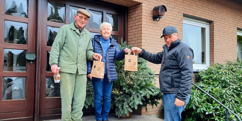 Die Gemeinde möchte in dieser schwierigen Zeit dennoch ein kleines Lächeln ins Gesicht zaubern und den Seniorinnen und Senioren mit einem kleinen Weihnachtsgeschenk eine Freude bereiten. Alle Einwohner ab 70 erhielten von der Gemeinde eine Tüte gefüllt mit leckeren Keksen, einen Schlüsselanhänger mit Deenser Wappen und einem Weihnachtsgruß. Verteilt wurden die kleinen Weihnachtstüten von den Ratsmitgliedern und das natürlich Coronakonform. So ergaben sich zwischen den Ratsmitgliedern und den Seniorinnen und Senioren (mit Abstand) meist ein kleines nettes Gespräch. Die ersten, die sich über eine Weihnachtstüte aus den Händen von Bürgermeister Dieter Helmer freuen konnten, waren das Ehepaar Elisabeth und Rolf Möller aus Deensen. Mit Ihren über 80 Jahren haben sie schon an viele Seniorenadventsfeiern der Gemeinde teilgenommen und hoffen, dass im nächsten Jahr wieder eine stattfinden wird.