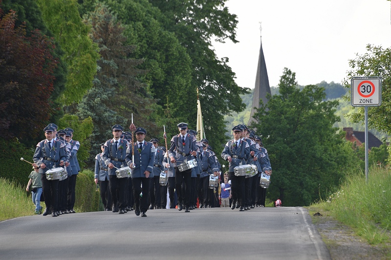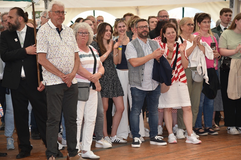 Unter großem Beifall marschierten am Abend die alten und neuen Majestäten in das Festzelt ein, begleitet von den eindrucksvollen Klängen des Spielmanns- und Fanfarenzuges Fürstenau. Mit einer etwa einstündigen Verspätung begann dort die feierliche Königsproklamation. Neben der Ehrung der neuen Könige wurden auch die alten Königspaare Sebastian und Silvia Balke sowie Niklas Stadermann und Mara Potthast würdig verabschiedet. Lothar Stadermann, der Vorsitzende der Schützengilde, verkündete die neuen Hofstaat-Mitglieder, die für eine Ortschaft dieser Größe bemerkenswert zahlreich sind.