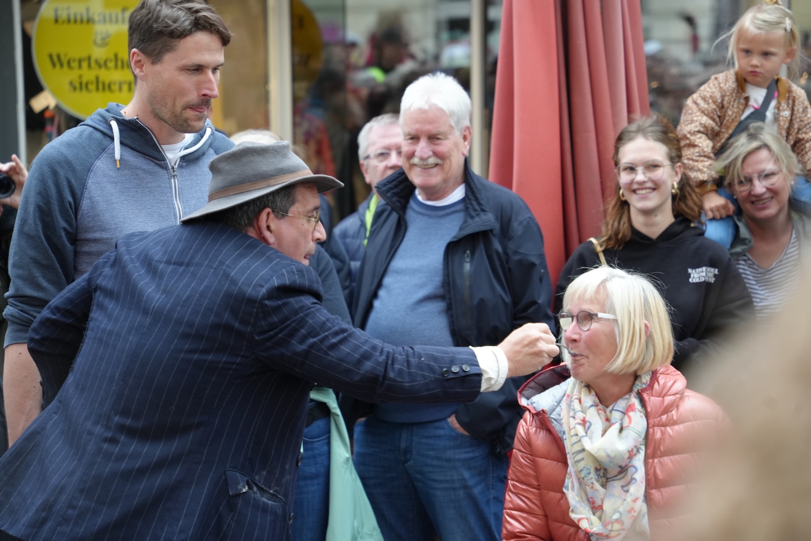 Den offiziellen Startschuss gab Bürgermeister Christian Belke am Freitagabend auf dem Parkplatz an der Bürgermeister-Schrader-Straße. Trotz unsicherer Wetterlage füllten sich die Bänke schnell – und mit dem Startschuss zeigte sich passend zur feierlichen Eröffnung sogar die Sonne. Belke sprach von einem „fantastischen Programm, großartigen Künstlern und einer tollen Atmosphäre“ und dankte ausdrücklich allen Beteiligten. Ein besonderer Dank galt dabei auch den Sponsoren – allen voran der Braunschweigischen Sparkassenstiftung, vertreten durch Oliver Fuchs, der für sein Engagement die Ehrenmedaille der Stadt erhielt. Ebenso hervorgehoben wurden Nicole Ruppert, künstlerische Leiterin der Stadt, und Heike Leupold von der Stadtbücherei – von Belke liebevoll als „Misses Straßentheater“ tituliert.