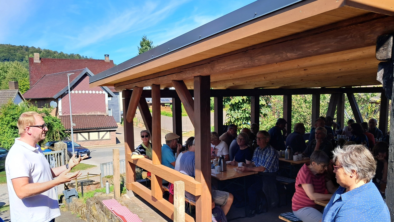 Nach einem Erfrischungsstopp an der Schutzhütte „Drei Kastanien“ führte die Tour bergab zum Backhaus des Heimatvereins Holzen, wo die Ehrenamtlichen des Vereins den leckeren Zuckerkuchen bereits vorbereitet hatten. Hier hatte auch der Geschäftsführer der Solling-Vogler-Region (SVR), Manuel Liebig, einen Informationsstand zum Thema Wandern aufgebaut. Zudem konnte für das Stempelheft der SVR ein Sonderstempel für die absolvierte 10-km-Wanderung erworben werden.