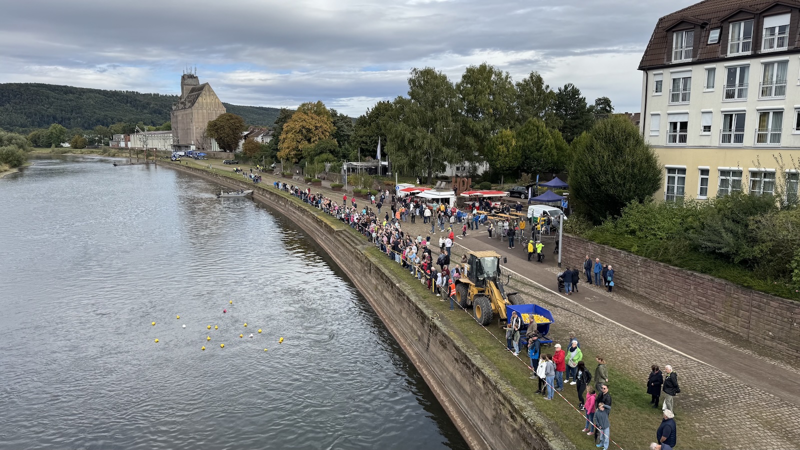 Holzminden (msp). Gelb, fröhlich, schwimmstark: Am Samstag, 13. September, war die Weser in Holzminden wieder fest in Entenhand. Genauer gesagt: in 3860 kleinen, nummerierten Quietscheenten, die beim traditionellen Entenrennen des Rotary-Clubs Holzminden ins Wasser gingen.