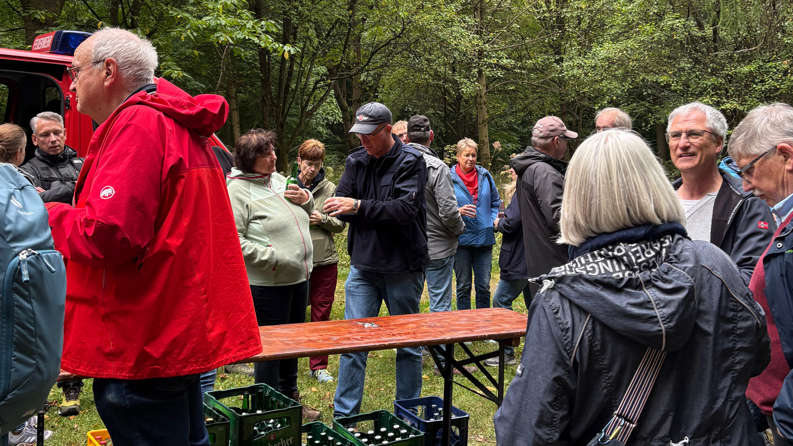 Weiter ging es zur Köhlerhütte, deren Bau 1972 abgeschlossen wurde. Sie erinnert durch ihre traditionelle Bauweise an die historische Köhlerei des 18. und 19. Jahrhunderts. Zum 50-jährigen Bestehen hatte der Heimatverein die Hütte 2021 aufwendig saniert – mit neuer Dachpappe und vollständiger Verkleidung. Bei der Grenzbegehung wurde die Geschichte dieser Hütte noch einmal lebendig.