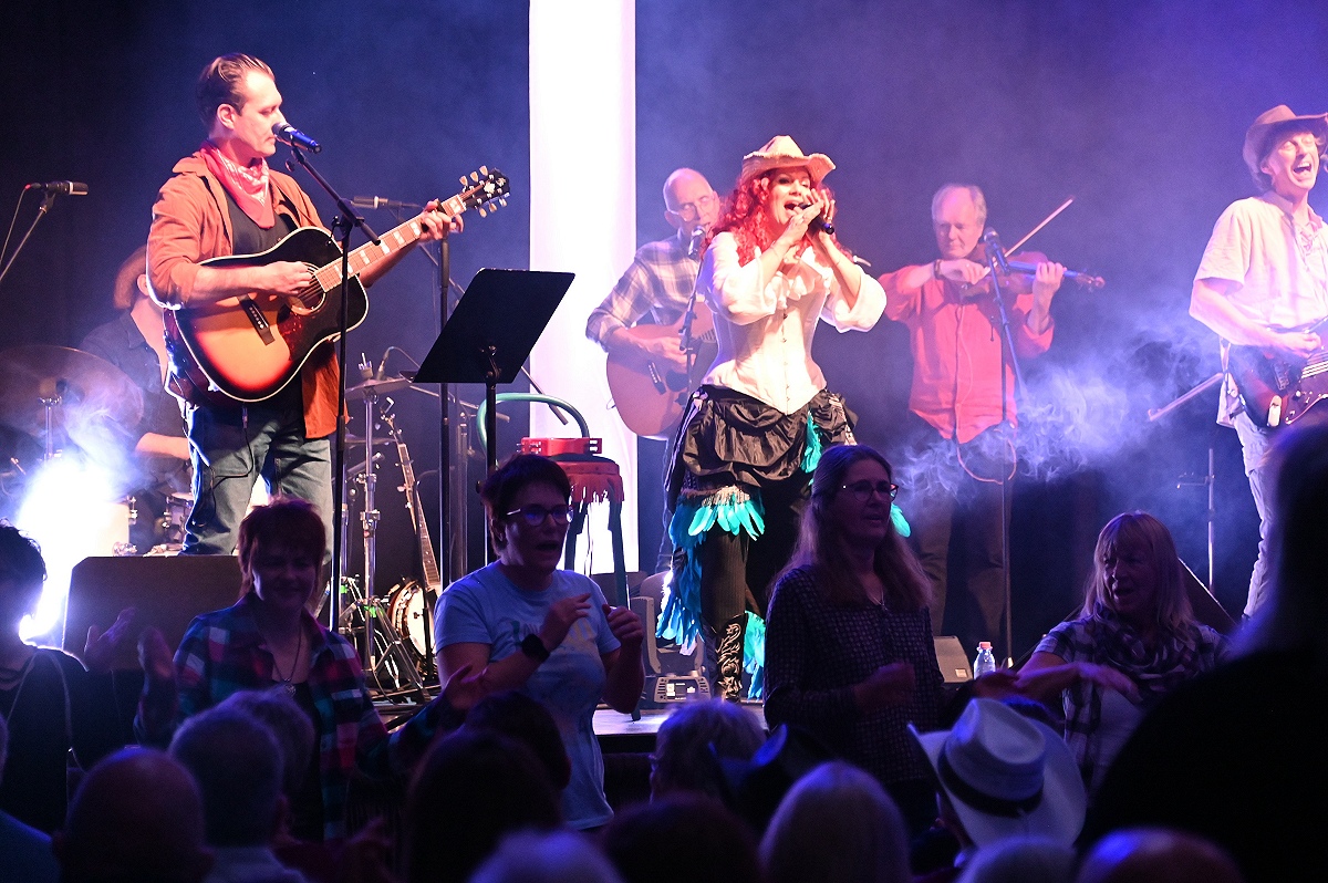 Die Gäste, zumeist echte Country-Fans, sangen und klatschten nicht nur mit, sondern griffen selbst „die Zügel in die Hand“: Am Rande der Sitzplätze führten sie zur Musik der Country-Band mehrere Linedances auf – direkt vor und neben der Bühne. Klassiker wie „Ring of Fire“, „Jolene“ oder „On the Road Again“ lösten Begeisterungswellen aus, während die Musikerinnen und Musiker eine Atmosphäre schufen, die an die Abende im legendären Honky-Tonk-District von Nashville erinnerte. „Eine derartige Country-Show hatten wir zum ersten Mal im Programm“, sagte Elke Reede von der Kulturgemeinschaft Beverungen.