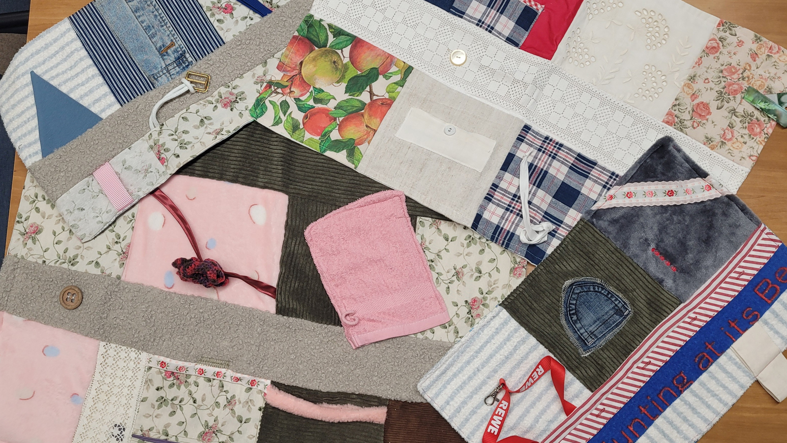Aus unterschiedlichen Stoffen, Farben und Motiven fertigten die Damen Dutzende Decken. Sie versehen die Decken mit Reißverschlüssen, Knöpfen, Schleifenbändern, Gürtelschnallen, Schlüsseln oder Garnrollen – Alltagsgegenständen, die die Wahrnehmung der Demenzpatientinnen und -patienten aktivieren und vorhandene motorische Fähigkeiten anregen sollen.