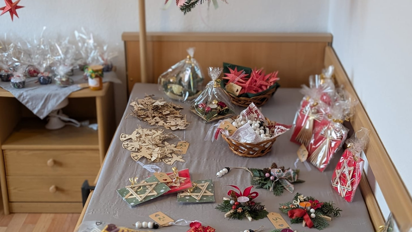 Die Besucherinnen und Besucher genossen den Nachmittag in gemütlicher Atmosphäre. Bei warmen Getränken, frisch gebackenem Kuchen und herzhaften Speisen bot sich reichlich Gelegenheit für Gespräche und Begegnungen. Die Bewohnerinnen und Bewohner der Senioren-WG hatten im Vorfeld mit viel Freude an der Herstellung der weihnachtlichen Dekoration mitgewirkt.