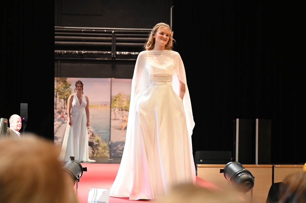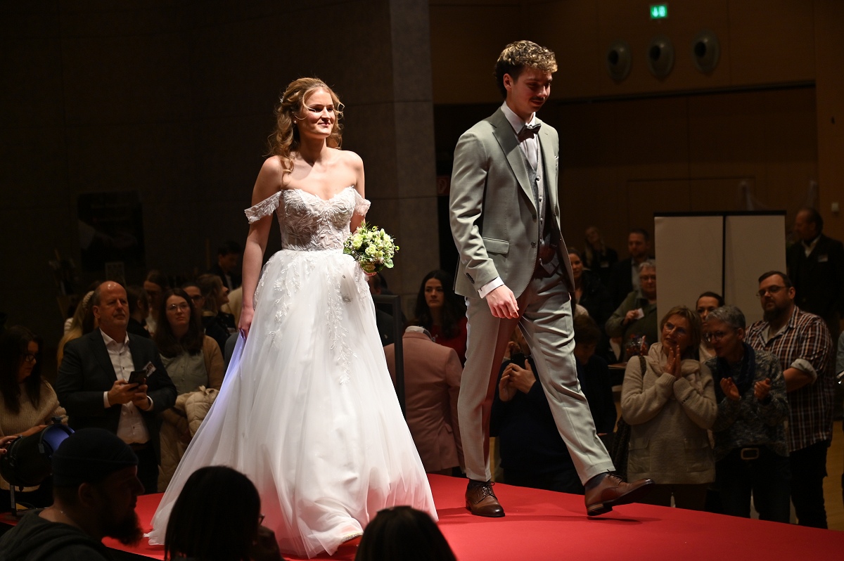 Höxter (TKu). Von der ersten Idee bis zum letzten Detail: Wer sich mitten in den Hochzeitsvorbereitungen befindet und Inspirationen suchte, insbesondere was die neuesten Trends betrifft, der war am Sonntag in der Residenz-Stadthalle in Höxter genau richtig. Bei der 30. Höxteraner Hochzeitsmesse, ausgerichtet von der Boutique Tinas Moden, drehte sich wieder einmal alles um den wohl schönsten Tag im Leben eines Paares. Die Messe bot eine gelungene Mischung aus Information, Inspiration und persönlicher Beratung. Drei Modenschauen, bei denen die aktuellen Hochzeitskollektionen 2026 vorgestellt wurden, waren die Höhepunkte der Messe, die etwa 500 Besucherinnen und Besucher angezogen hat. Zeitlose und wandelbare Designs seien aktuell sehr gefragt. Bettina Hörnlein von Tinas Moden erläuterte, dass aktuell hauptsächlich abnehmbare Röcke und Schleppen im Trend lägen, um den Übergang von Trauung zu Feier flexibel zu gestalten. Ergänzt würden diese durch integrierte Taschen, Beinschlitze in weich fließenden Chiffonröcken, schlichte Satinröcke oder weit geschnittene Kleider für den „Prinzessinnenmoment“. Ein hoher Tragekomfort und der Wohlfühlfaktor spielten bei der Beratung stets eine zentrale Rolle. Auch bei der Mode für den Bräutigam zeigten sich neue Akzente. Moderne Farbtöne setzten frische Impulse, während klassische Modelle, wie in Blau, weiterhin gefragt blieben.