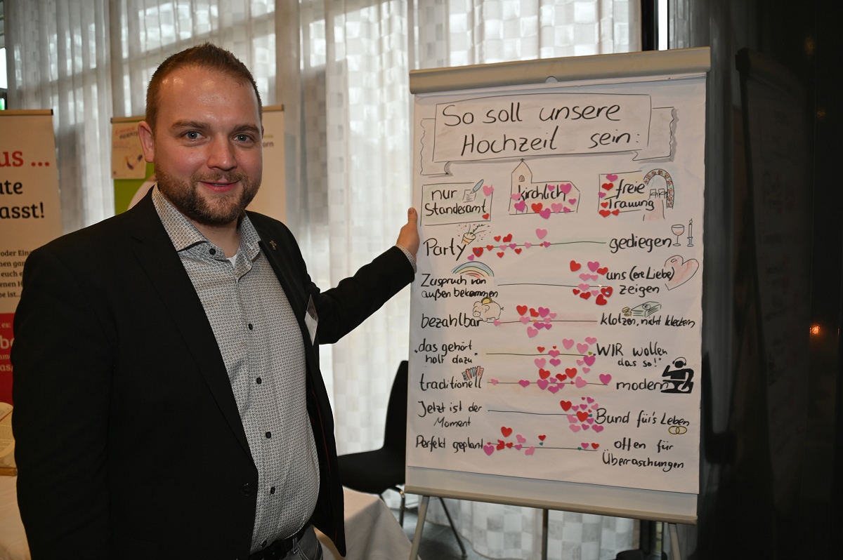 Auch Gastronomie, Konditoreihandwerk, Musik sowie Hochzeitssängerinnen und weitere Dienstleistungen rund um das Feiern waren vertreten. Mit Pfarrer Tim Wendorff und seinem zweiköpfigen Team war auch die Kirche vertreten. Er beriet die Paare nicht nur, sondern sammelte auch deren Meinungen zu ihrer geplanten Hochzeit.