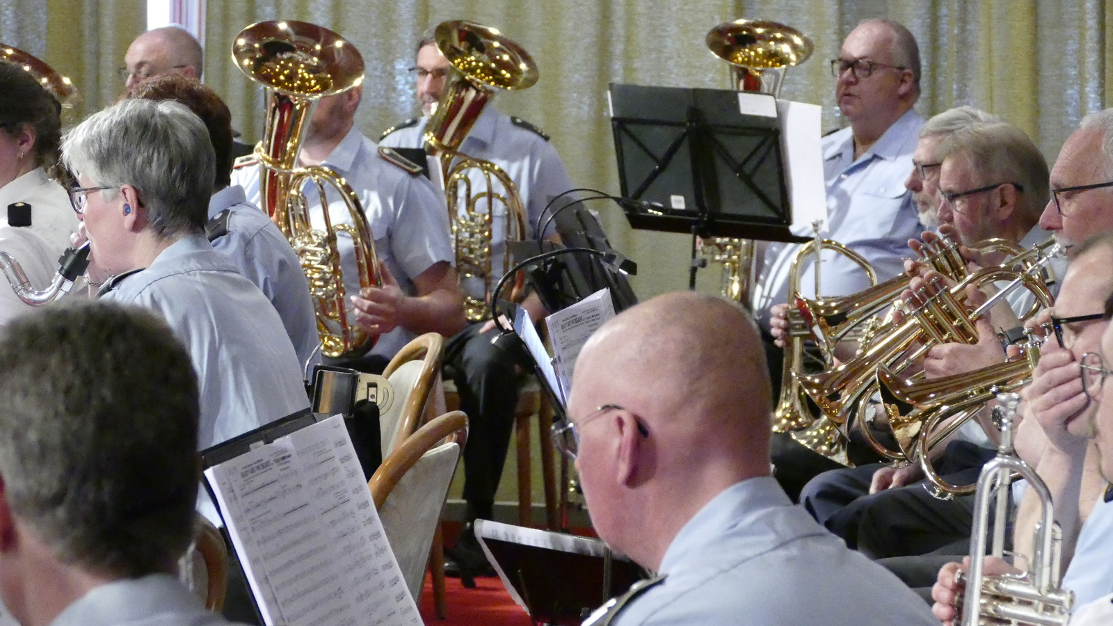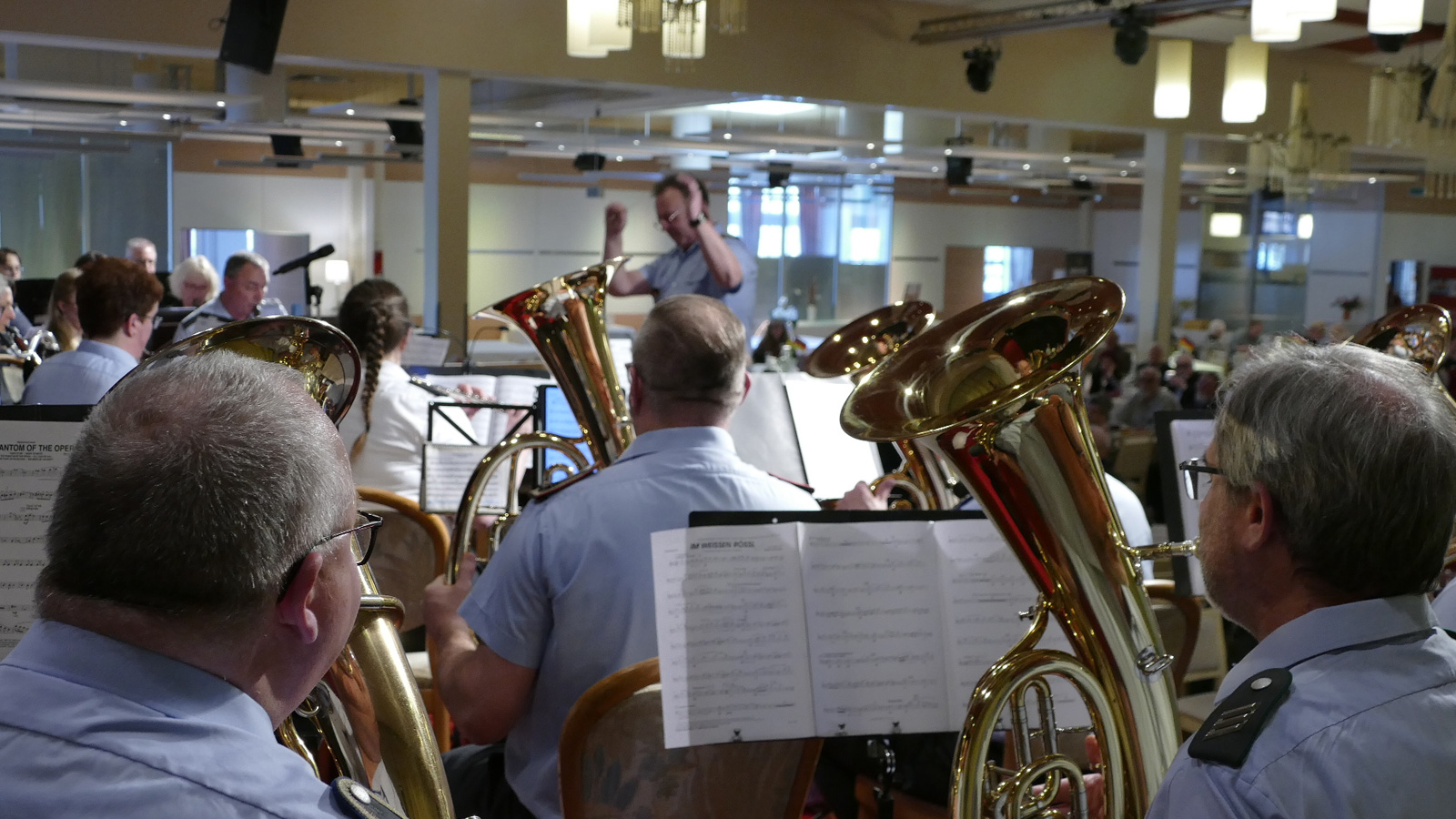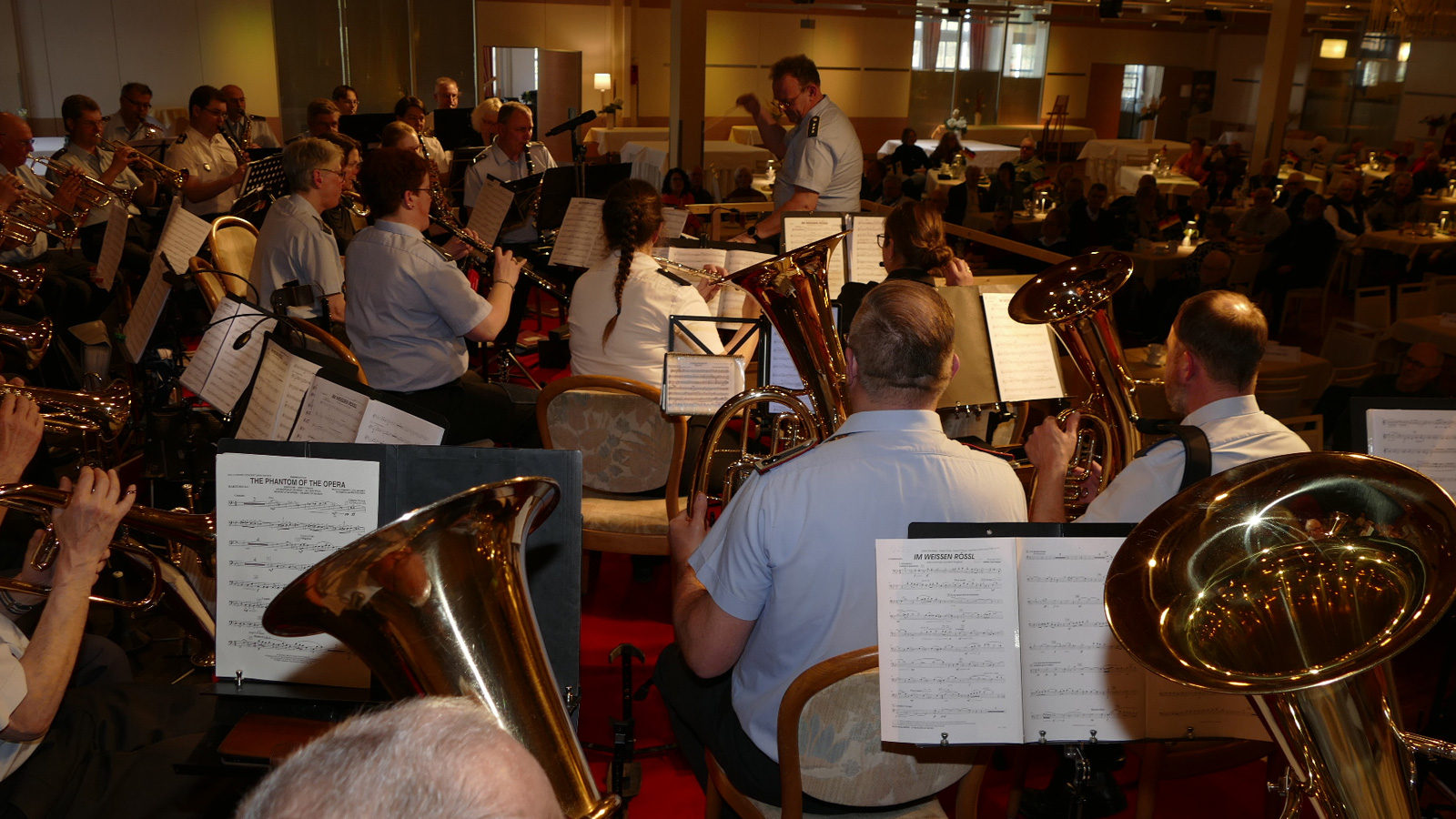 Im weiteren Programm boten die rund drei Dutzend Musikerinnen und Musiker den Gästen einen abwechslungsreichen Mix aus Märschen wie dem „Russian March“, „Nibelungen-Marsch“ oder „King Robert March“, aber auch Polkas wie „Im weißen Rössl“ oder „Von Freund zu Freund“. Ebenso waren Stücke aus „Phantom der Oper“ und „Beauty and the Beast“ Teil des rund dreistündigen Konzerts.