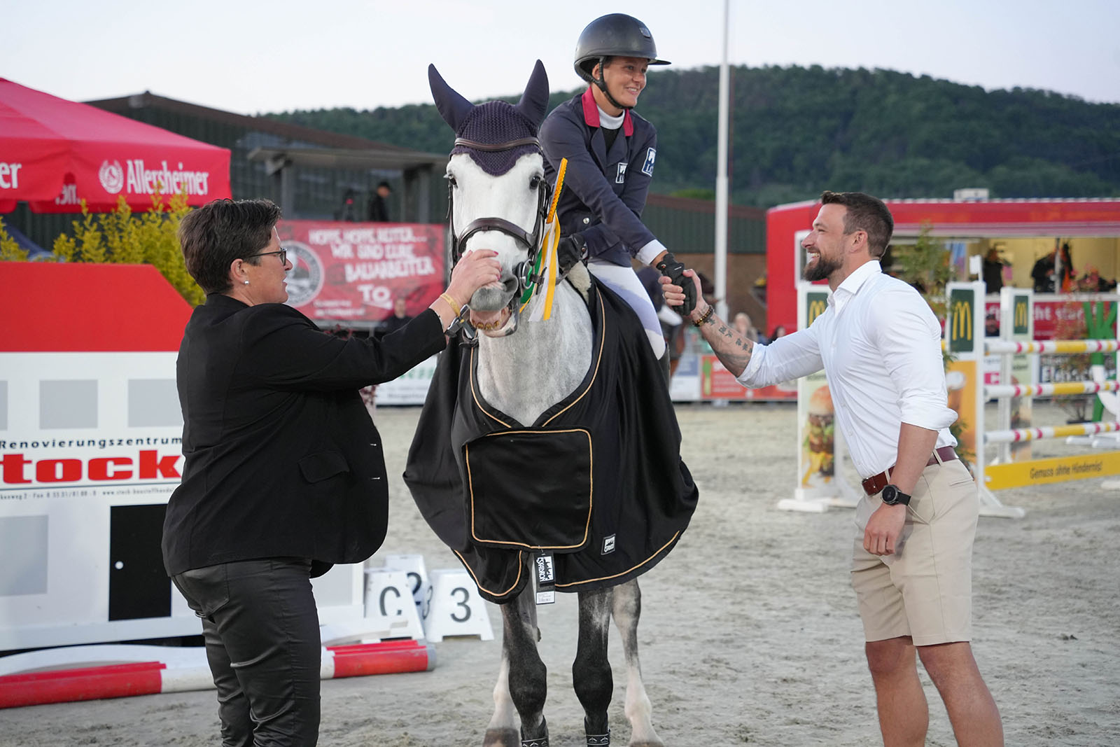 Bevern (zir). Was für ein Abend in Bevern: Nicht nur Sonne pur, sondern auch ein eng getaktetes Programm mit vielen Highlights bescherte dem Reitturnier zahlreiche Besucherinnen und Besucher. Am Abend gegen 18 Uhr startete die erste Springprüfung der Klasse "S*" (Schwer). Mit einer Hürdenhöhe von 140 Zentimetern konnten die Springer samt Pferd beweisen, was in ihnen steckt. Am Ende durfte sich Laura Strehmel mit ihrem Pferd "Moonraker 14" zur Siegerin erklären. Mit einer Zeit von 55,44 Sekunden setzte sie sich knapp von Platz zwei ab, den Niclas Baule mit "Caguyahime Moana" und einer Zeit von 55,91 Sekunden belegte. Strehmel erhielt für ihren Sieg einen Gutschein von "Caravan Park Müller" im Wert von 1.000 Euro.
