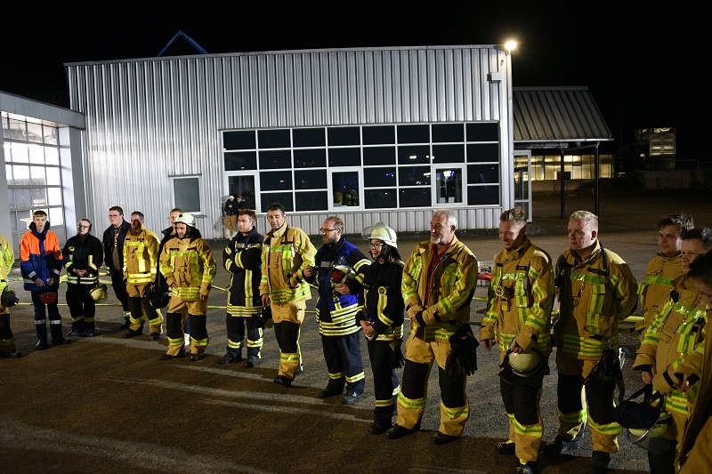 Zwei Automechaniker sollen sich noch im dichten Rauch befinden, die es zu retten gilt. Einerseits muss das Feuer gelöscht und andererseits die Menschenrettung eingeleitet werden – es geht um Zeit, alles muss schnell gehen! So schnell wie möglich setzt die Feuerwehr genügend Atemschutzgeräteträger von allen Einheiten ein, um die bewusstlosen Personen aus der Werkstatt heraus in Sicherheit zu bringen. Erst danach wird das Feuer, simuliert durch Blitzleuchten, gelöscht. Die Übungsleiter Patrick Ostermann und Christian Wintermeyer (Zugführer des Löschzuges 2) waren mit ihren Einsatzkräften sehr zufrieden, wie sie betonen. Als Belohnung gab es für alle Feuerwehrleute nach einer Begehung des Autohauses und der technischen Begutachtung eines E-Autos Getränke und Bratwurst, was vom Autohaus Beineke für die Einsatzkräfte gesponsert wurde.