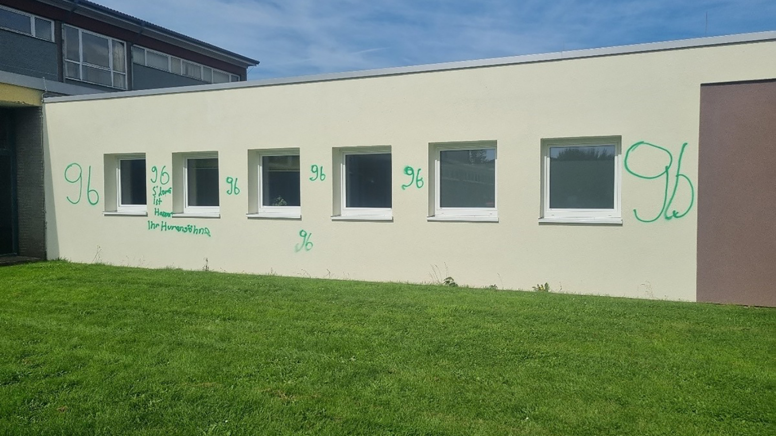 Deensen (red). Nachdem bereits Anfang August diverse Sachbeschädigungen im Stadtgebiet von Stadtoldendorf festgestellt wurden, erhielt eine Funkstreifenwagenbesatzung der Polizeistation Stadtoldendorf am Sonntag (03.09.2023) Kenntnis von neue Farbschmierereien, diesmal in der Gemeinde Deensen. Nach bisherigen Erkenntnissen sind diese von Samstag (02.09.2023) auf Sonntag (03.09.2023) im hintere Bereich des Schulhofes der Grundschule sowie an einem Bushaltestellenhaus im Ortsbereich entstanden. Die Farbschmierereien zeigen in den meisten Fällen die Zahl "96" und wurden mit grüner Farbe gesprayt.