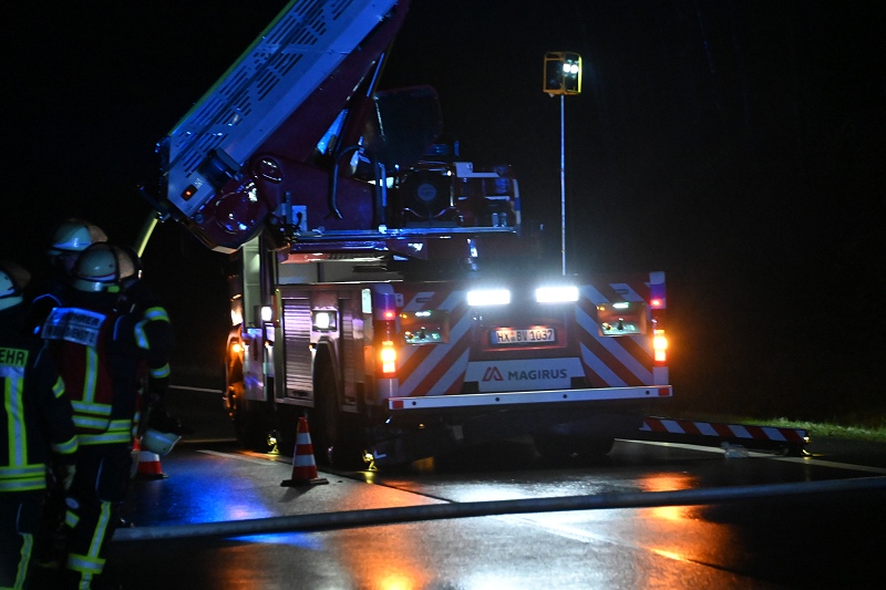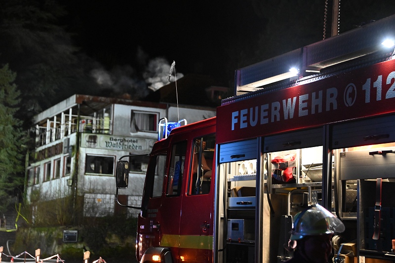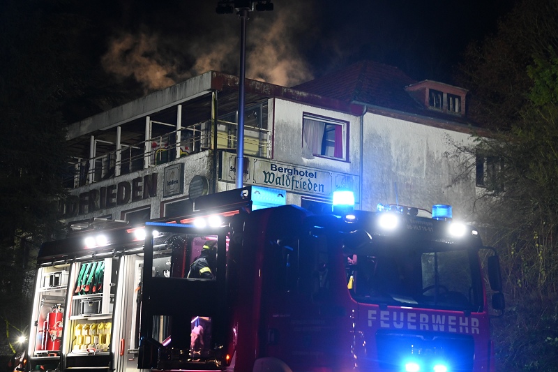 Beverungen (TKu). Großfeuer an der B83 zwischen Beverungen und Herstelle: Das einst prächtige Berghotel „Waldfrieden“ an der B83 war vor vielen Jahrzehnten ein beliebter gesellschaftlicher Treffpunkt in Beverungen. Nach einem Brand vor genau 30 Jahren, am 15. Januar 1994, wurde es geschlossen und öffnete seine Pforten nie wieder. Am späten Mittwochnachmittag, den 03. Januar 2024, brannte es erneut in diesem maroden „Lost Place“. Die Freiwillige Feuerwehr Beverungen wurde um 16:55 Uhr alarmiert, weil Feuerschein von innen nach außen gedrungen ist. Sofort wurde mit dem Stichwort „Feuer 4“ ein Großalarm für die Einsatzkräfte in Beverungen und Umgebung ausgelöst. 95 Einsatzkräfte der Feuerwehr und des Rettungsdienstes waren in den ersten Minuten schnell vor Ort. Alarmiert waren neben einem Abrollbehälter Atemschutz des Kreises Höxter und einem Einsatzleitwagen 2 aus Höxter, der den Einsatz jedoch wieder abbrechen konnte, die Beverunger Einheiten der Kernstadt sowie die Löschgruppen aus Herstelle, Würgassen, Amelunxen, Drenke, Wehrden, Dalhausen, Jakobsberg und Haarbrück. Die Löschgruppe Tietelsen stellte derweil den Grundschutz in Beverungen sicher.