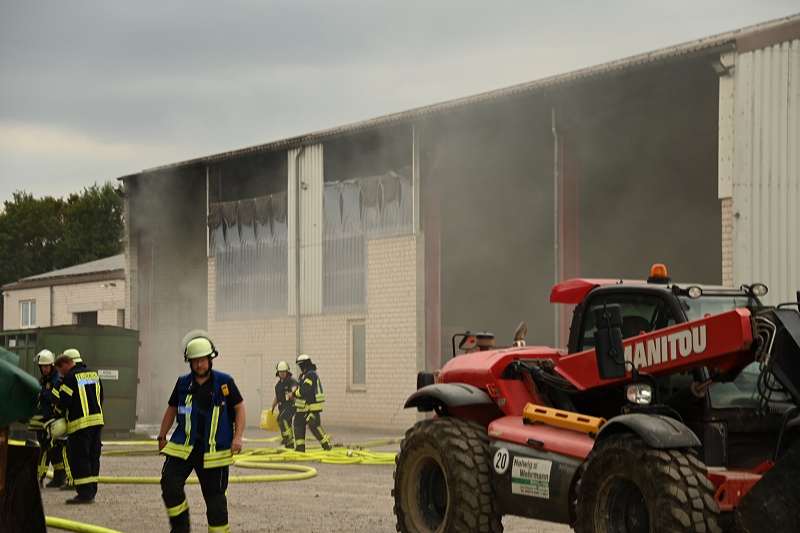 Um ein erneutes Aufflammen zu verhindern, wurde das Brandgut im Anschluss mit einem Radlader aus der Halle gefahren und im Freien weiter abgelöscht durch Feuerwehrleute unter Atemschutz. Die starke Rauchentwicklung war im gesamten Industriegebiet deutlich wahrzunehmen, er zog mit dem Wind weiter und war noch hunderte Meter von der Brandstelle entfernt wahrzunehmen. Das kontaminierte Löschwasser wurde im Kanalsystem aufgefangen und zurückgehalten, laut Einsatzleiter Sebastian Hundt. Dank des schnellen und koordinierten Einsatzes der Feuerwehr konnte der Brand ohne größere Schäden an umliegenden Gebäuden gelöscht werden. Über die genaue Ursache des Feuers gibt es derzeit noch keine Informationen. Die Ermittlungen hierzu dauern an. Der Einsatz der Feuerwehr zog sich noch bis in die späten Abendstunden hin, um das gesamte Brandgut restlos abzulöschen.