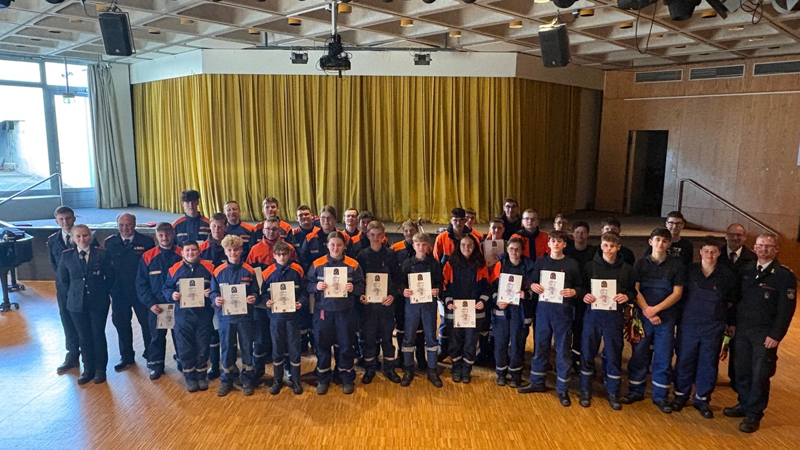 Nach erfolgreicher Abnahme fand in der Aula des Gymnasiums Beverungen die feierliche Verleihung statt. Zahlreiche Ehrengäste würdigten die Leistungen der Jugendlichen, darunter Mitglieder des Stadtrates, die stellvertretende Landrätin Magdalena Volmert, der stellvertretende Kreisbrandmeister Jürgen Schmits, der stellvertretende Feuerwehrleiter Marius Ulrich, Kreisjugendfeuerwehrwart Florian Mantel sowie seine Stellvertreter Anette Knipping und Bruno Horstmann.