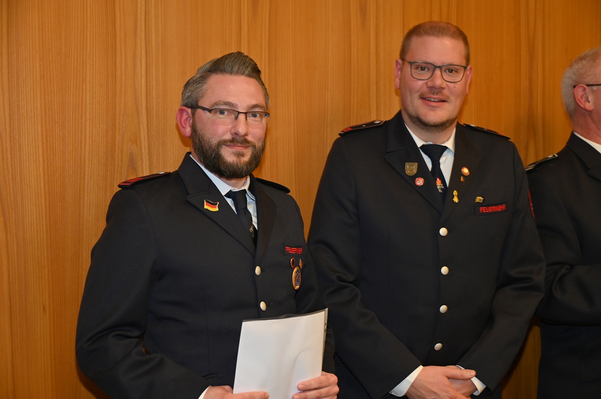 Für zehn Jahre aktiven Dienst wurden Unterbrandmeister Timo Heine und Fabian Rosner in Abwesenheit sowie Hauptfeuerwehrmann Julian Jöhren und Unterbrandmeister Maximilien Meise ausgezeichnet. Urkunden für 20 Jahre aktive Mitgliedschaft erhielten Rudolf Lützer, Patrick Haller und Lukas Heine.