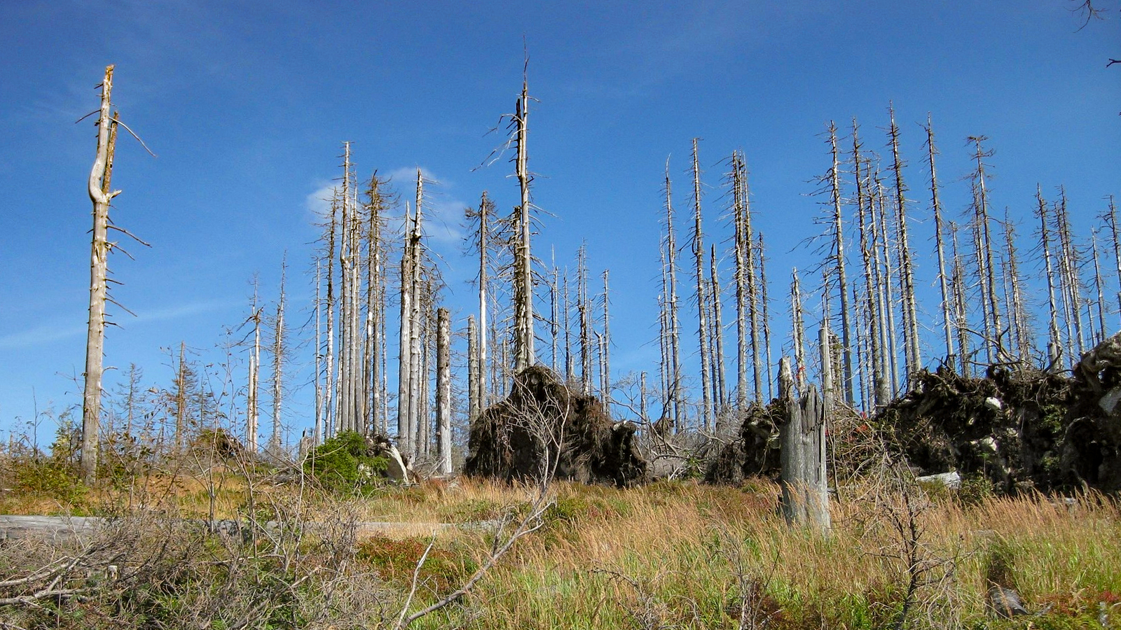 Der Harz gehört zu den am stärksten vom Waldsterben betroffenen Regionen in Niedersachsen. Jahrzehntelange Fichtenmonokulturen haben die Wälder anfällig für Trockenheit und Schädlinge gemacht. Seit den Dürrejahren 2018 bis 2022 sind große Flächen abgestorben – allein im Forstamtsbereich Lauterberg rund 7.700 Hektar.