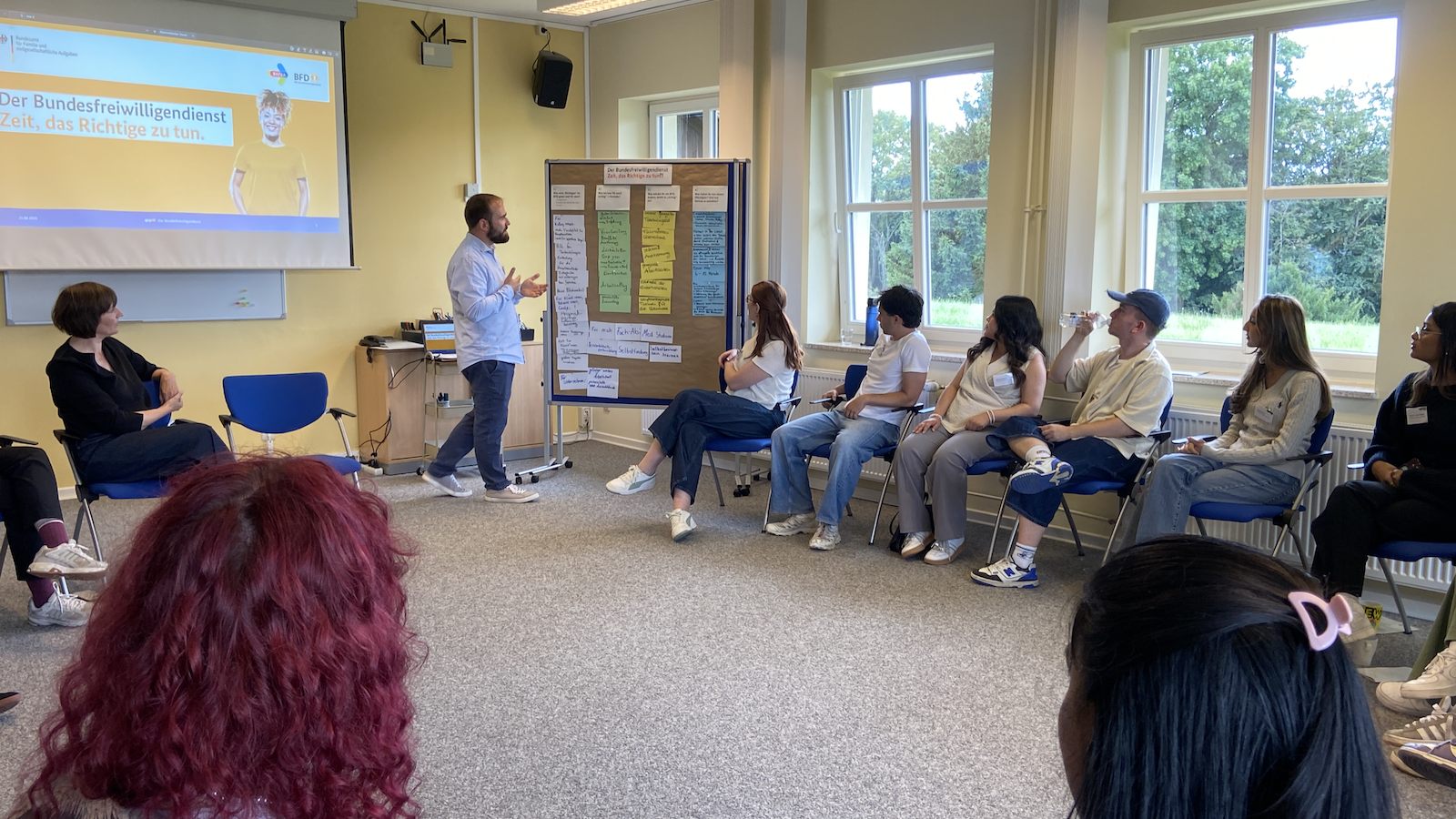 Im Anschluss hatten die Besucher die Möglichkeit, in ein Seminar hineinzuschnuppern. In einem Stuhlkreis reflektierten die Teilnehmenden den Nutzen ihres Freiwilligendienstes. Auf einer Tafel standen unter dem Stichwort „Vorteile“ Begriffe wie „Gap Year“, „Verantwortung“, „Erfahrungen“ und „Struktur“. Die jungen Erwachsenen schätzten die beruflichen Erfahrungen an ihren Einsatzstellen und sahen darin eine Chance zur persönlichen Weiterentwicklung. „Es ist gut, nach der Schule erst einmal zu sich zu finden und dennoch eine gewisse Struktur zu haben“, schildert eine Teilnehmerin.