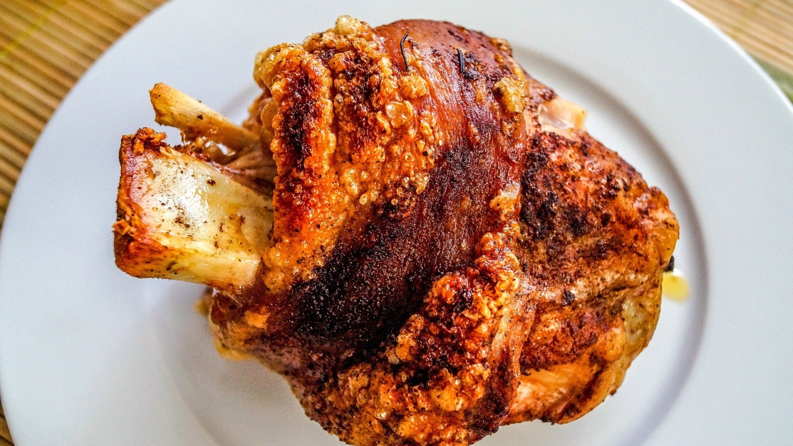 Schweinshaxe mit Sauerkraut und Brot (13 €)