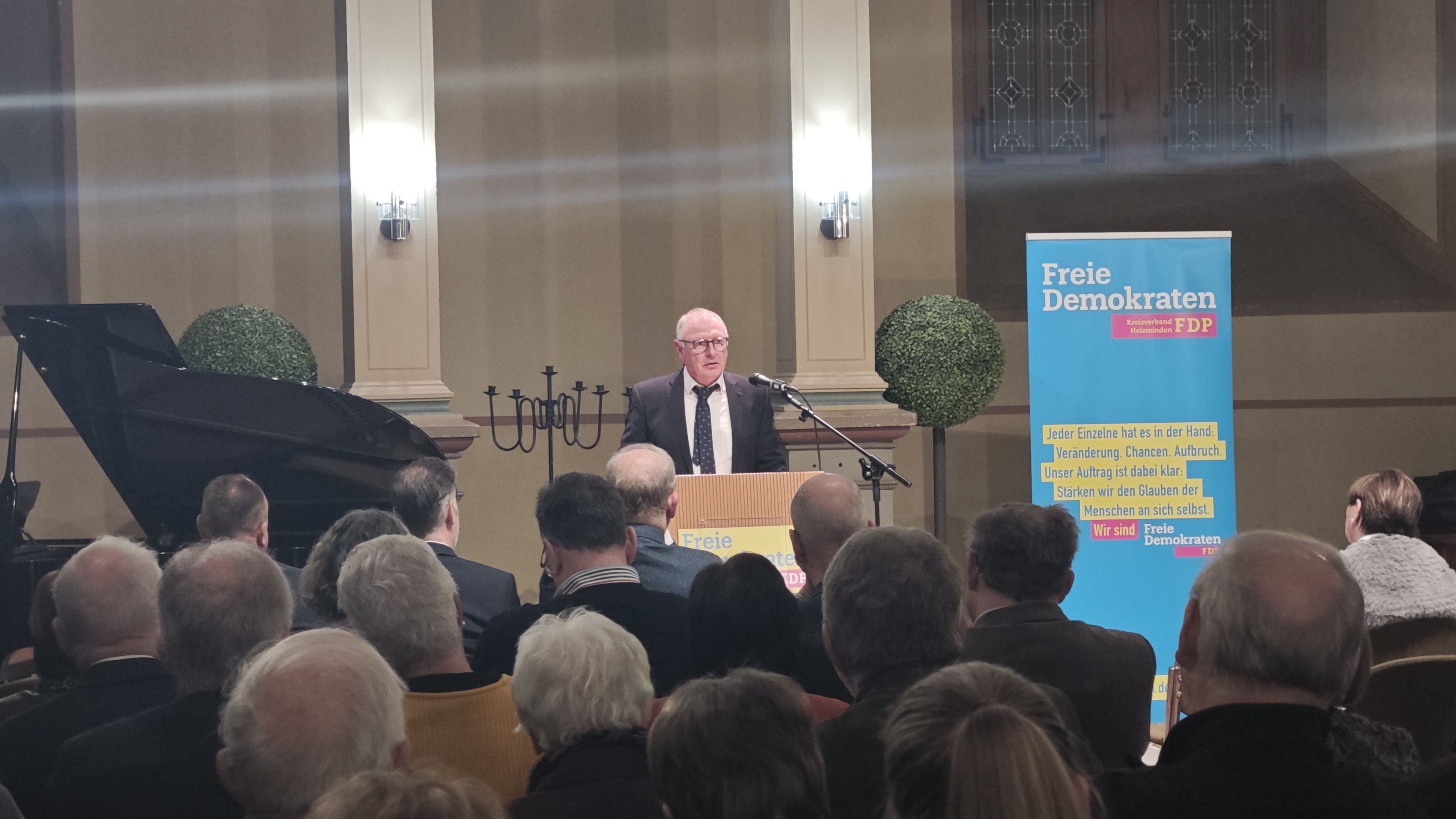 Gegen Ende der Veranstaltung ergriff auch Beverns Bürgermeister Burkhard Dörrier das Wort. Sichtlich bewegt zeigte er sich von den Ausführungen Christian Dürrs und sprach von einem „Kloß im Hals“ nach dessen Rede. Dörrier räumte ein, dass politisch nicht immer die richtigen Entscheidungen getroffen worden seien, betonte jedoch, dass aus Fehlern gelernt werden müsse. Wichtig sei es, trotz aller Herausforderungen optimistisch in die Zukunft zu blicken. Bund und Land würden davon profitieren, wenn die FDP wieder in die Parlamente einziehe. Mit Blick auf die angespannte Finanzlage der Kommunen – insgesamt mehr als 55 Milliarden Euro Schulden – machte er deutlich, wie schwer es sei, den Bürgerinnen und Bürgern Perspektiven zu geben, wenn Zusagen finanziell kaum einzuhalten seien. Auch in der Bildungspolitik äußerte Dörrier deutliche Kritik, etwa an der Abschaffung des schriftlichen Dividierens in Niedersachsen. Abschließend erinnerte er an einen zentralen Leitsatz der FDP: „Vorfahrt für die Vernunft“, und verband damit die Hoffnung, dass dieser Anspruch auch künftig handlungsleitend bleibe.