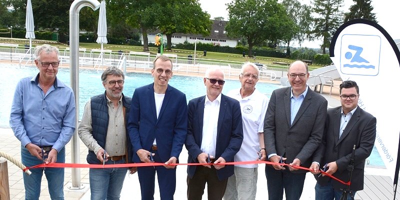 Höxter (TKu). Bürgermeister Alexander Fischer erklärte das Höxteraner Freibad am vergangenen Samstag für eröffnet: „Endlich ist wieder Leben im Freibad Höxter“, sagt der BfH-Fraktionsvorsitzende Ralf Dohmann gegenüber Höxter News bei der Wiedereröffnung des Höxteraner Freibades nach einer langen Schließungs- und aufwendigen Sanierungsphase am vergangenen Samstag. Gemeinsam mit Bürgermeister Alexander Fischer, Günther Ludwig (CDU), Werner Böhler (SPD), Michael Schuster (UWG), Hermann Dücker (Freibad-Förderverein) und dem Architekten Benjamin Cessa von der Planungsgruppe Hildesheim durchschnitt er das rote Band für die symbolische Eröffnung des Freibades.
