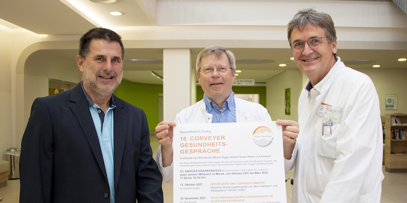 Von Oktober 2021 bis März 2022, immer am zweiten Mittwoch im Monat, findet ein Vortrag im Konferenzraum des St. Ansgar Krankenhauses statt. Beginn ist um 17 Uhr, der Eintritt ist frei, ebenfalls kann kostenfrei geparkt werden. Die Corveyer Gesundheitsgespräche werden von der AOK NordWest und dem Kulturkreis Höxter-Corvey Schloss Corvey unterstützt. "Wir freuen uns sehr, dass diese Kooperation nun schon so viele Jahre Bestand hat und die Veranstaltungsreihe trotz Corona-Pandemie auch in diesem Jahr stattfinden kann", sagt AOK-Teamleiter Prävention Hans-Jürgen Nolte. Mit den bisherigen Themen und Diskussionen konnten die Arzt-Patienten-Seminare schon viele Bürger aktivieren, sich mehr um ihre Gesundheit zu kümmern: Alle Interessierten bekommen Informationen aus erster Hand, die Referenten halten ihre Vorträge in leicht verständlicher Sprache. Die Themen reichen von der Behandlung von Vorhofflimmern, über minimalinvasive Operationsmöglichkeiten beim Leistenbruch bis zu modernen, individuellen Behandlungsmöglichkeiten bei Krebs. Am Mittwoch, 13. Oktober, beginnen die Corveyer Gesundheitsgespräche mit einem Vortrag zum Thema Herzrasen und Vorhofflimmern: Moderne Verödungsverfahren mit „Mini-Kathetern und Kälteballons“ können helfen. Als Referent steht Chefarzt Dr. Eckhard Sorges zur Verfügung. Anmeldungen werden angenommen im Sekretariat der Medizinischen Klinik I unter Telefon 05271/66-2705 oder per E-Mail unter