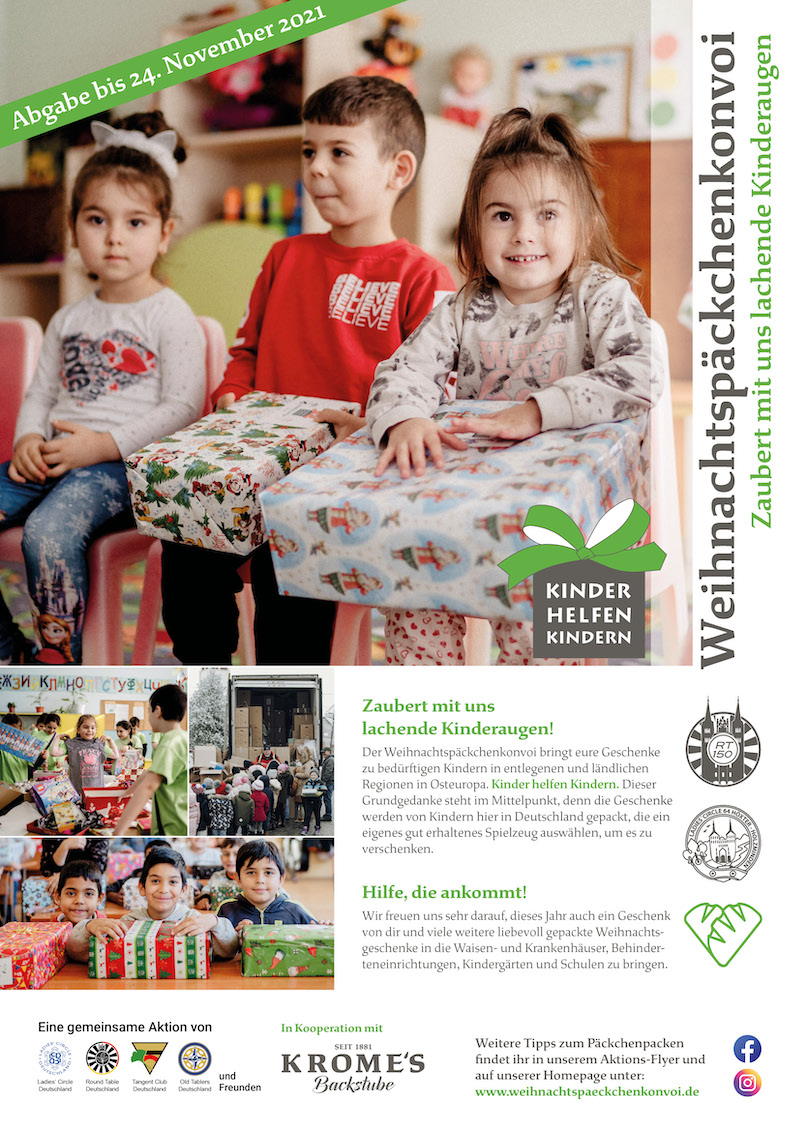 Holzminden/Höxter (lbr). Die ersten Banner und Plakate hängen: der Weihnachtspäckchenkonvoi 2021 steht in den Startlöchern. Bis zum 24. November können Päckchen gepackt und abgegeben werden. Als starker Partner steht die Bäckerei Krome dem Ladies Circle, Old Table und Round Table zur Seite. „Wir freuen uns Teil dieser tollen Aktion sein zu dürfen“, so Monika Krome. Alle Filialen der Bäckereien Krome und Westbomke dienen als Abgabestellen für die gepackten Päckchen.