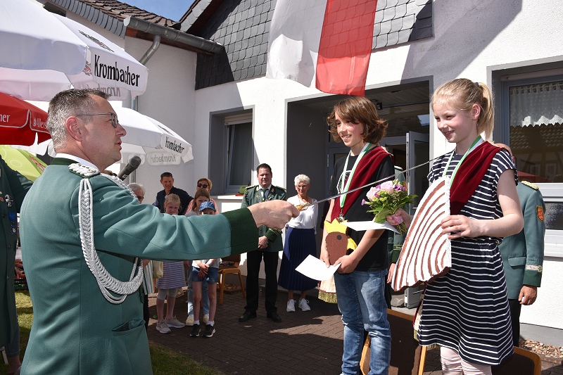 Lüchtringen (TKu). Tiago Struck (11) und Judith Beverungen (10) sind das neue Kinderkönigspaar von Lüchtringen. Beide haben den Vogel am Sonntag bei traumhaftem Wetter mit Pfeil und Bogen abgeschossen vor der St. Johannes Baptist Kirche in Lüchtringen. Während Tiago Struck den Kopf des Styropor-Adlers mit seinem Pfeil zu Fall brachte, traf Judith Beverungen den rechten Flügel und schoss ihn zu Boden.