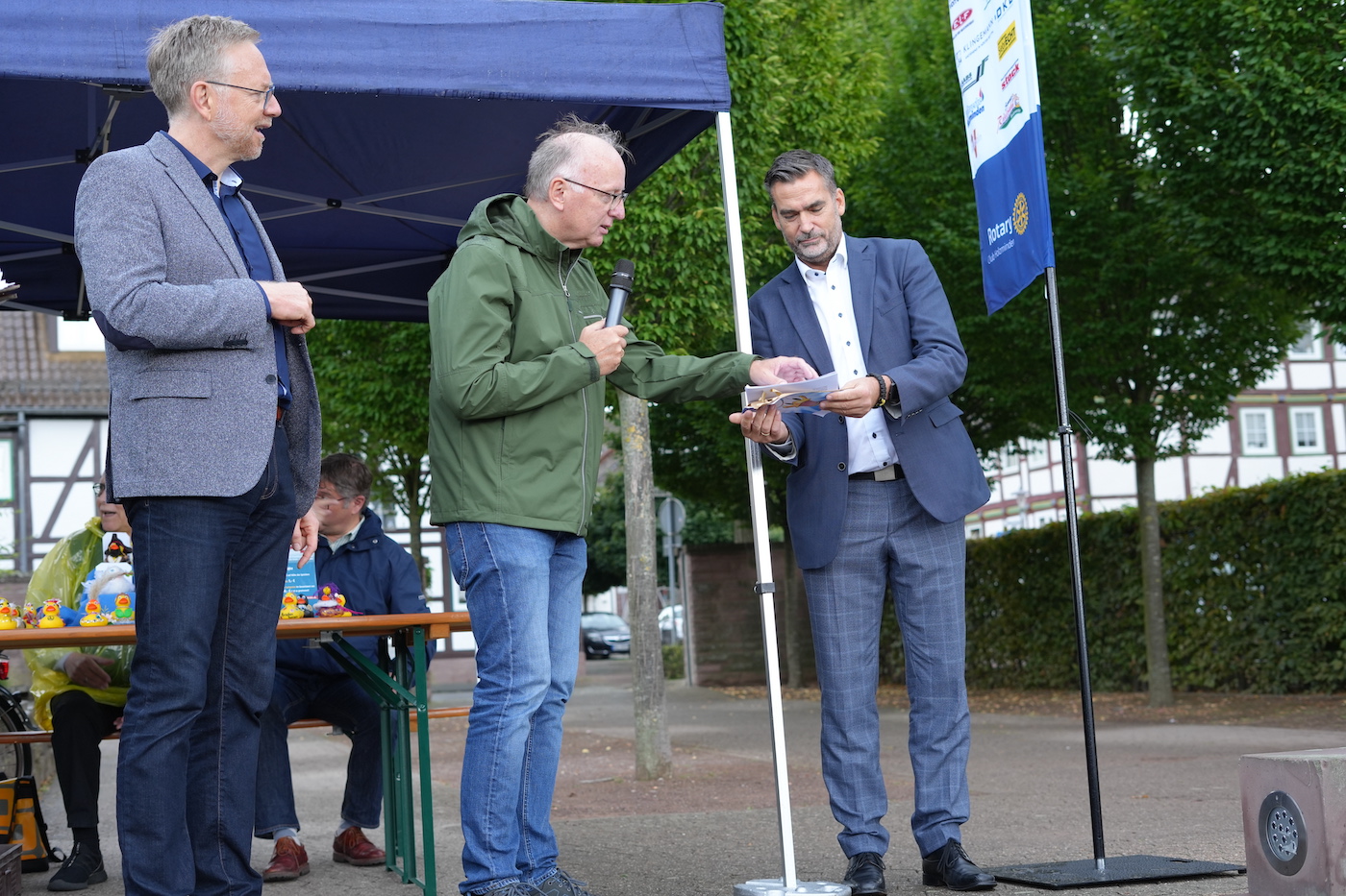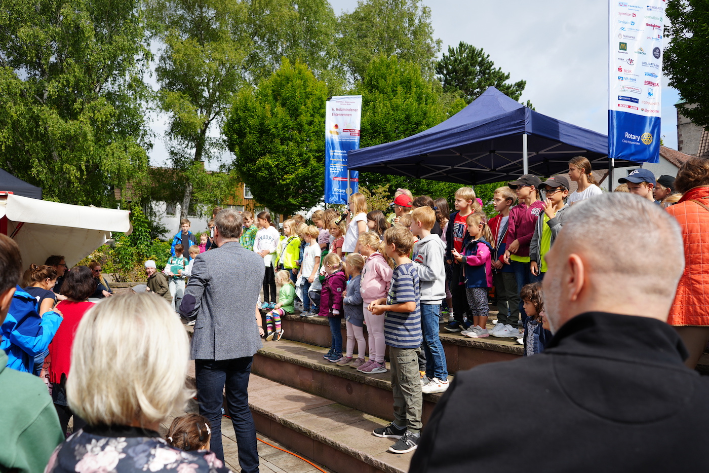 Moderator Markus Finger, Präsident Dr. Andreas Brandt und Holzmindens Bürgermeister Christian Belke eröffneten die Veranstaltung und leiteten durch das Programm. Gestartet wurde mit dem Prominenten-Rennen. Kreishandwerksmeister Karl-Heinz Bertram, Superintendentin Christiane Nadjé-Wirth, Vertreter des Jugend- und Seniorenrates, die Landtagsabgeordneten Sabine Tippelt, Hermann Grupe, Christian Meier und Uwe Schünemann, Ortsvorsteher Gerd Schläger, TAH-Geschäftsführerin Sandra Becker, Ratsvorsitzende Maren Urban, die Polizei Holzminden, Bürgermeister Christian Belke sowie Höxters Bürgermeister Daniel Hartmann schickten jeweils eine große Ente von der Weserbrücke aus ins Rennen. Die Ente von Uwe Schünemann entschied das Rennen für sich und der Landtagsabgeordnete spendet seinen Gewinn von 500 Euro an den Kinderschutzbund Holzminden.