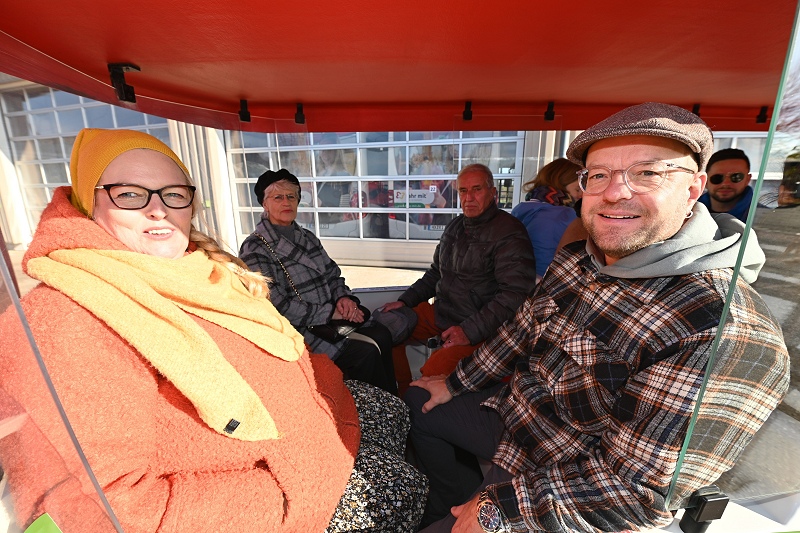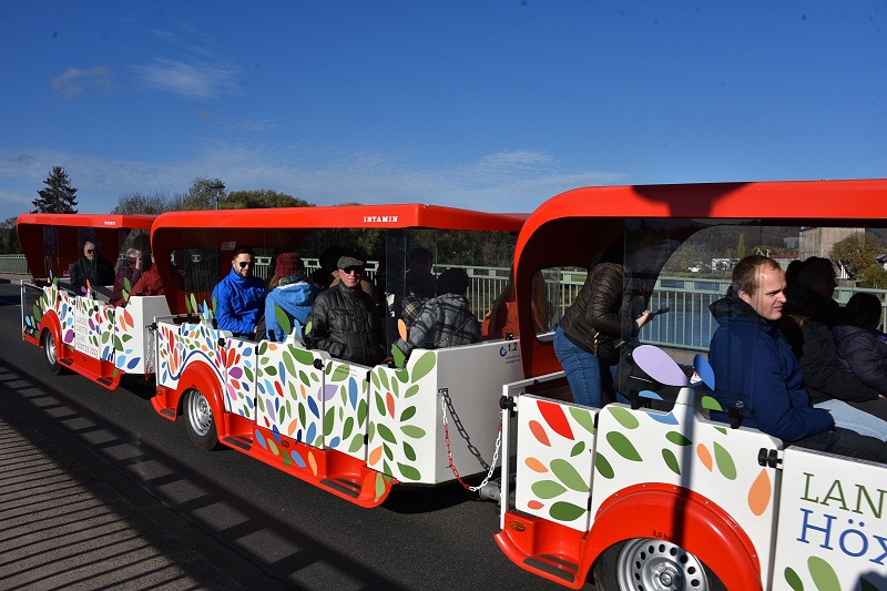 „Manchmal hörte es sich allerdings an, als wenn wir ein Eichhörnchen überfahren haben“, meinte Lia mit Mama Jeanette. Nach 40-minütiger Fahrt kam die Bimmelbahn mittags zum verkaufsoffenen Sonntag, dem Holzmindener „Herbstglühen“ mit Streetfood Festival in der niedersächsischen Nachbarstadt an, wo die 30 Höxteraner:innen von Bürgermeister Christian Belke, LGS-Elfe Holli und dem Landesgartenschau-Team begrüßt wurden.