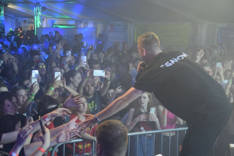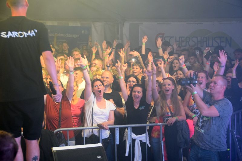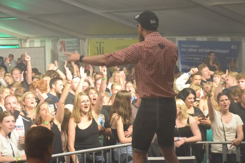 Gegen 22:20 Uhr stand auch schon der erste Hauptact auf die Bühne. Schürze war aus Mallorca angereist und sorgte gleich mit seinem aktuellen Hit „Bumsbar“, zunächst in a cappella und dann mit Musik im Hintergrund, für ausgelassene Partystimmung im Festzelt. Während seines Auftritts, zu dem auch die Hits „Layla“ und „kleine Fee“ gehörten, rief er dem Publikum zu, dass die Stimmung hier besser als im Bierkönig sei, was bei den Besuchern natürlich gut ankam.