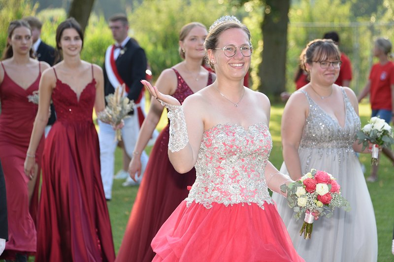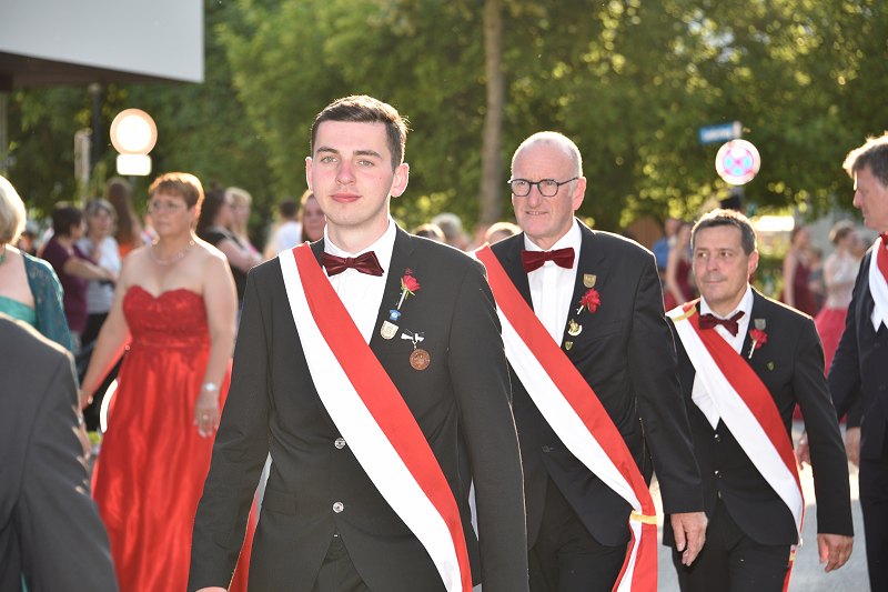 Die Freiwillige Feuerwehr nutzte derweil die Zeit, um ein anderes Ritual zu vollziehen – die Feuertaufe frischer Kameradinnen und Kameraden. Wer neu in die Feuerwehr in Lüchtringen eingetreten oder nach dahin gewechselt ist seit dem letzten Feuerwehrfest im Jahr 2019, der musste nach dem Ritual der Feuerwehrleute einmal im Wasserbehälter in Feuerwehrkleidung „getauft“ werden – sprich baden gehen. Und so hieß es für Frederick Hamelmann, Roman Thater, Noah Hesse, Carsten Olandt, Yannik Fricke, Anna-Lena Becher, Kilian Klinke sowie Jens Cooper einmal kurz untertauchen im Wasserbehälter. Weil Matthias Begemann den Vogel abgeschossen hat und zum neuen Feuerwehrkönig gekrönt worden ist, musste auch er auch einmal in das erfrischende Nass untertauchen. Als neue Jubiläumskönige neben Feuerwehrkönig Begemann von der Löschgruppe Lüchtringen proklamiert wurden: Jonas Heine von den ehemaligen Majestäten und Dieter Linnenberg als neuer Bürgerschützenkönig. Als Anerkennung für ihr 450-jähriges Jubiläum wurde der Schützenbruderschaft St. Johannes e.V. im Festzelt außerdem die Hochmeisterplakette vom stellvertretenden Diözesanbundesmeister Franz Heinrichsmeier überreicht.