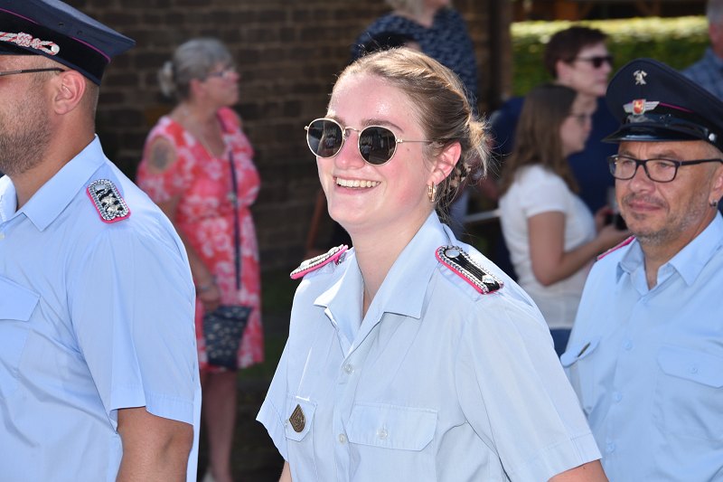 Das Jubiläumsfest war auch der Höhepunkt für das Lüchtringer Altkönigspaar Bernd und Christine Heukrodt sowie das Jungkönigspaar Sven und Kira Schafer, die gemeinsam mit ihren Hofstaaten am Freitag und Samstag im Umzug als Paare mit dabei gewesen sind. Während die Lüchtringer Vereine und die befreundeten Schützenabordnungen am Freitag sowie auch am Samstag in den Umzügen mit von der Partie waren, so stand der Umzug am Sonntag ganz im Zeichen der Freiwilligen Feuerwehr. Sämtliche Löschgruppen und Löschzüge der Stadt Höxter, die Nachbarwehren aus Niedersachsen und weitere Feuerwehren aus dem Kreis Höxter waren am Umzug beteiligt. Während des großen Festumzuges am Sonntag wurden die Ansprachen an der Friedenseiche so kurz wie möglich gehalten. Wichtig war der Feuerwehr aber eine Schweigeminute zum Gedenken an die vor einigen Tagen bei einem Brandeinsatz ums Leben gekommenen Feuerwehrleute in St. Augustin gedacht und auch dafür Spenden gesammelt. Zum 115-jährigen Bestehen überreichte Kreisbrandmeister Stefan Nostiz eine Ehrenurkunde des Kreises Höxter an Löschgruppenführer Andreas Bohnenpoll. Zu den Gratulanten gehörte aber auch der stellvertretende Bürgermeister Hans-Josef Held, der sich für den „aufopferungsvollen“ Einsatz im Namen aller Bürgerinnen und Bürger bedankte.