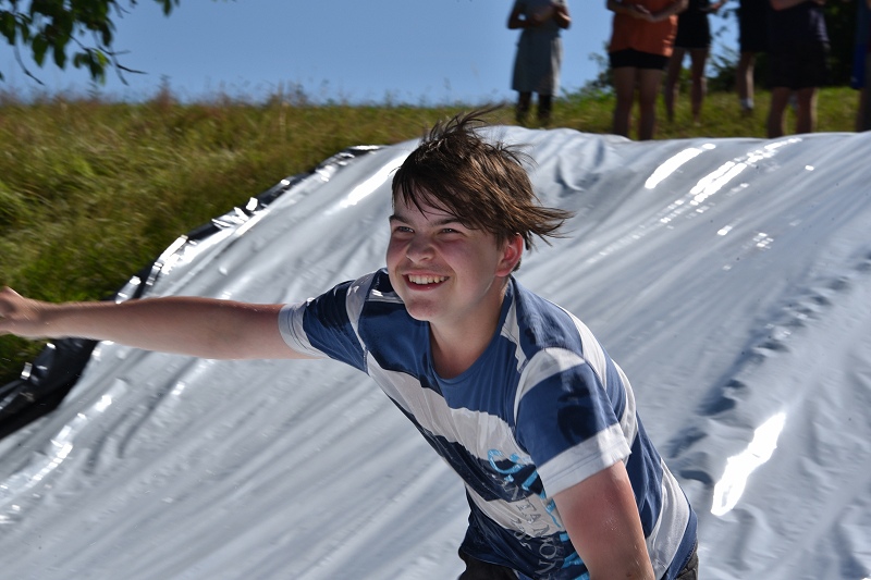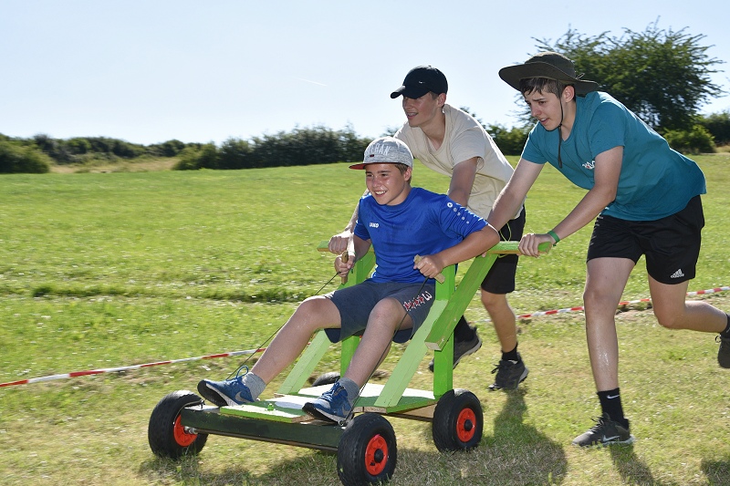 Auf die Olympiade haben die Gruppen während der SoLa-Woche ebenfalls hingearbeitet. Neben Geländespielen, der Beschäftigung mit christlichen Geschichten und dem Sinn des Lebens hat jede Gruppe an einer Seifenkiste gearbeitet, die am vergangenen Freitag zum Einsatz gebracht wurde bei der großen Olympiade auf einem dafür extra geschaffenen Areal. Die Seifenkisten haben die Lagerteilnehmer mit Bauteilen aus dem Baumarkt eigenständig und ohne technische Anleitung zu einem fahrbaren Untersatz geformt während der Woche. Am großen Showdown des Sommerlagers nahmen 56 Kinder und Jugendliche teil, die in vier Gruppen gegeneinander angetreten sind. Die insgesamt vier Gruppen haben sich nach den griechischen Stadtstaaten Theben, Sparta, Delphi und Athen benannt. Der Showdown war ein Rennen mit den selbstgebastelten Seifenkisten auf einer eigens präparierten Rennbahn, welches sich an das Nintendo-Konsolen-Spiel „Mario-Kart“ angelehnt hat, mit eigenen Regeln und witzigen Einlagen. Dabei wurden die Teilnehmenden unter anderem mit einem Wasserschlauch nass gespritzt, mit Wasserbomben abgeworfen, die zuvor bei dem Wasserrutschen-Spiel erkämpft werden konnten oder sie erhielten Unterstützung durch Betreuer an der Rennstrecke, die sie „geboostet“ haben, wenn sie beim Rennen weit zurückgelegen haben.