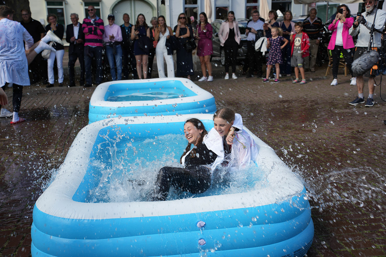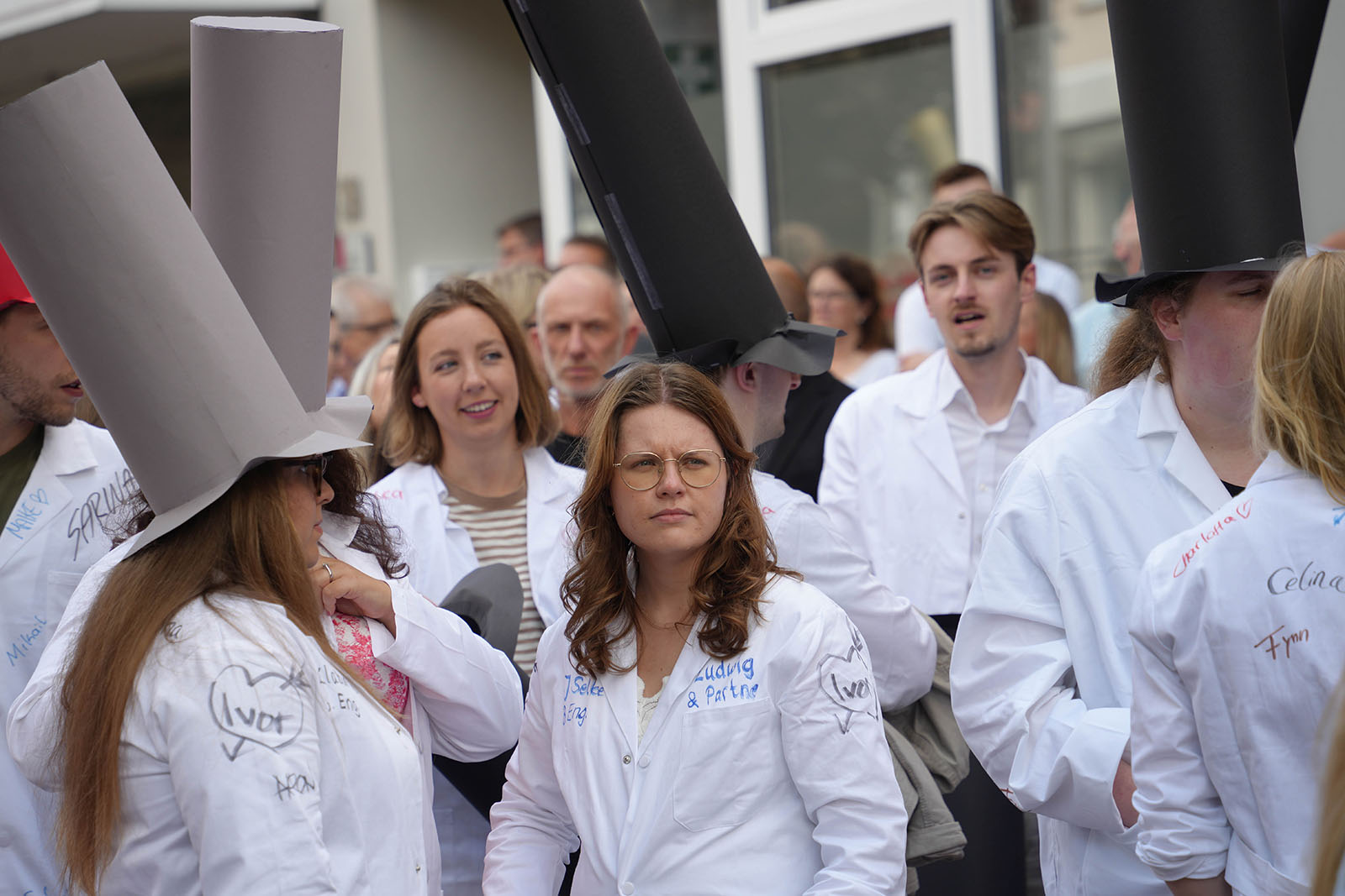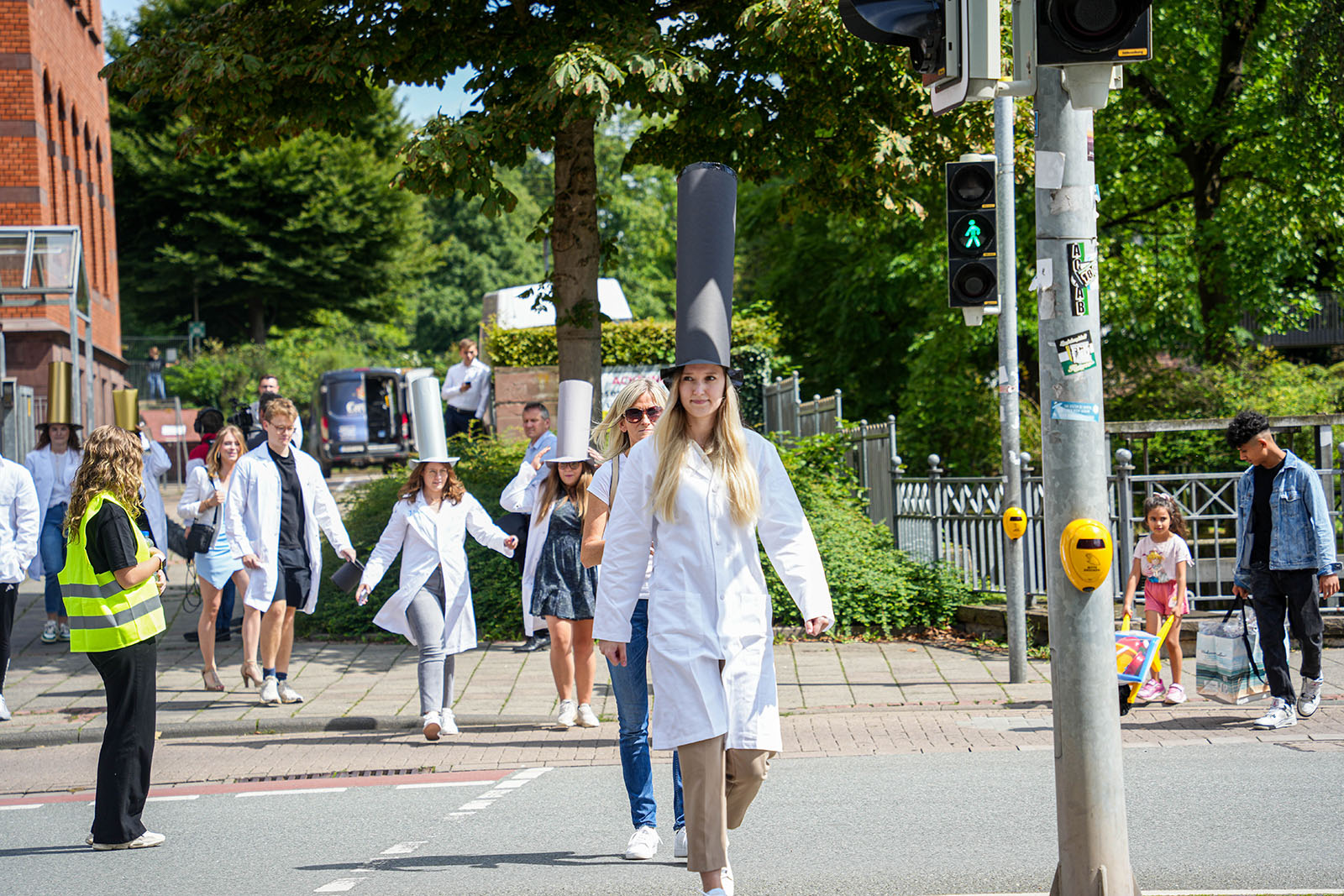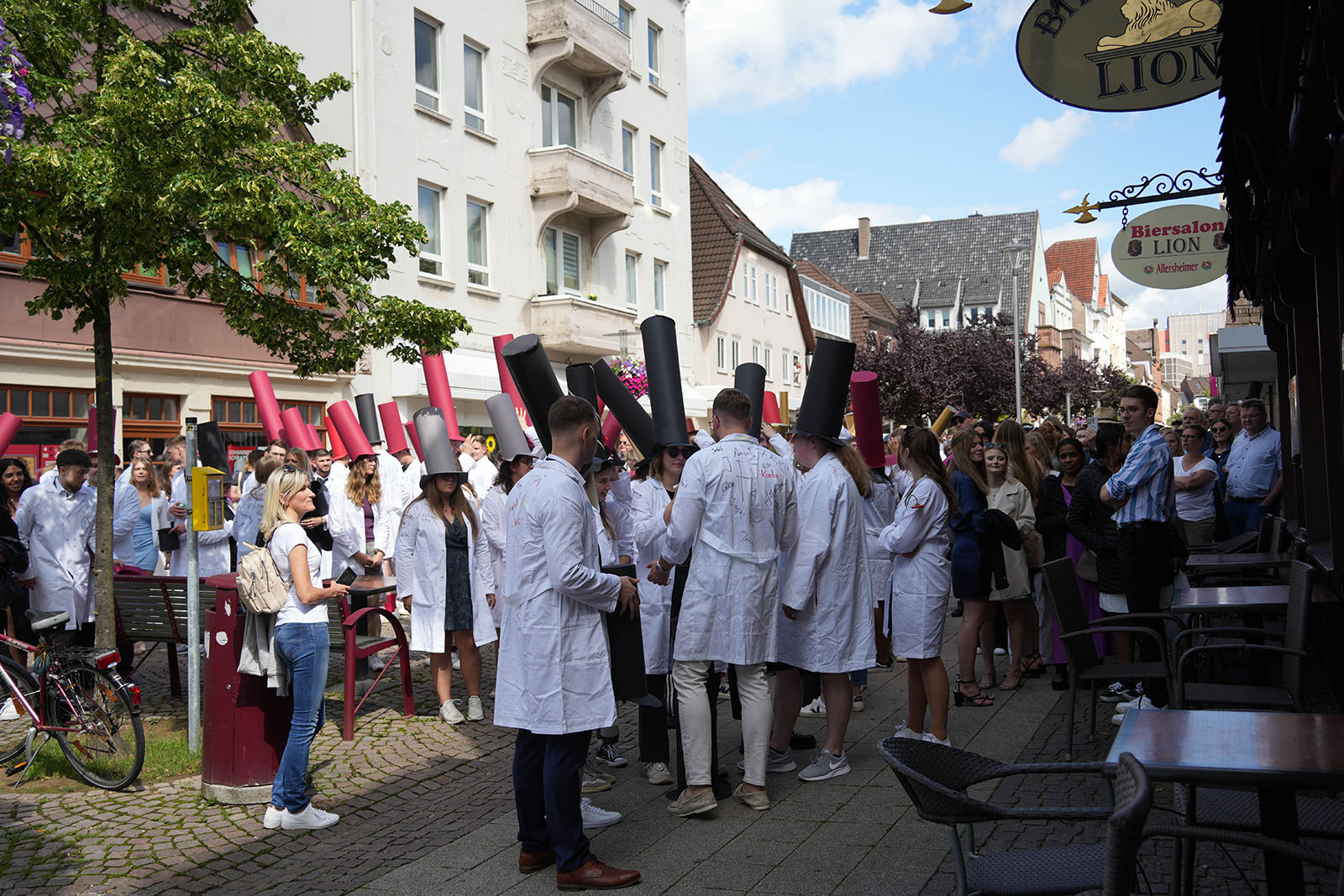 Abschließend folgte der traditionelle Meisterumzug durch die Innenstadt Holzmindens. Um Punkt 15 Uhr wurde zunächst das Glockenspiel am Reichspräsidentenhaus bewundert, ehe es dann zu der Weserbrücke ging. Doch davor musste ein Stopp am Biersalon Lion eingelegt werden, um die Kräfte mit einem Bier wieder aufzutanken. An der Brücke angekommen, erwarteten Freunde und Familie sehnsüchtig das „Hütewerfen“ in die Weser. Mit großem Applaus und Jubel zogen die Absolvierenden weiter zum Marktplatz, wo dann die Pooltaufe wartete. Freiwillig oder auch unfreiwillig warf man dann Absolventen, aber auch Professoren in zwei mit Wasser gefüllte Pools. Trocken blieb dabei kaum jemand. Am Abend folgte dann der Abschlussball im Lichthof.
