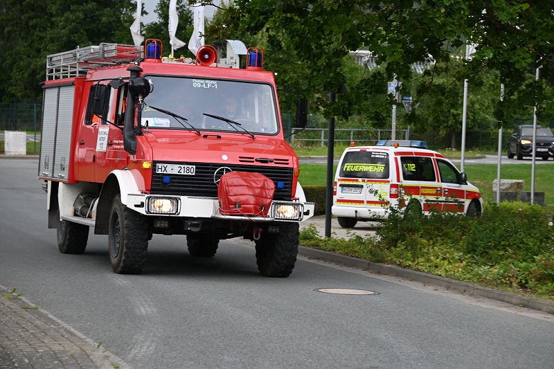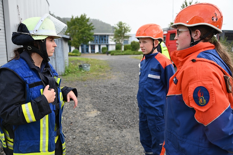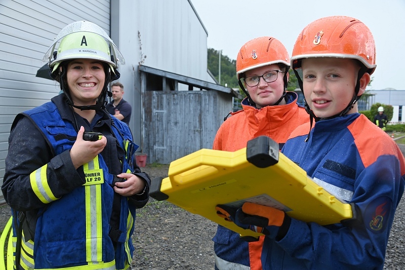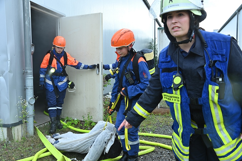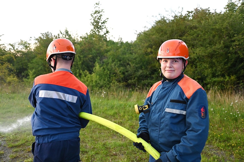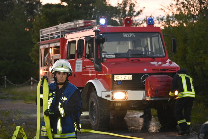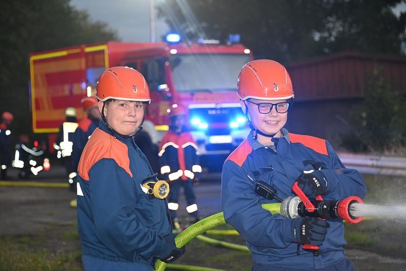 Erst am Abend wurde es im wahrsten Sinne des Wortes wieder „heiß“. Ein Brand in einer Halle im Industriegebiet, bei dem sich zwei Personen in Lebensgefahr befanden, musste bewältigt werden. „In der Feuerwehrsprache heißt das dann 'Feuer-MIG' – also eine Feuermeldung, bei der sich Menschenleben in Gefahr befinden“, erklärt Patrick Wichmann. Im Industriegebiet Lüre gab es dann auch alle Hände voll zu tun, zwei versteckte Puppen warteten in der vernebelten Halle der Fahrschule Schelhorn auf Hilfe. Da war ein schneller Löschangriff nebst Menschenrettung vonnöten, bei der jeder Handgriff sitzen musste. Weiter ging es erst nach dem abendlichen Grillen um 21:30 Uhr mit einer Feuermeldung auf dem Flugplatz Höxter-Holzminden, wo ein Haufen Paletten in Flammen stand. Schon von weitem waren die Flammen und der Rauch zu sehen. „Geil, ein echter Brand“, meinte die 16-jährige Jugendfeuerwehrfrau Sophie. Wieder hieß es, einen Löschangriff von allen Seiten aufzubauen, um das Feuer zu bekämpfen. Nachdem auch dieser Einsatz bewältigt und die Feuerwehrgeräte wieder einsatzbereit verstaut waren, hieß es erneut „Ruhezeit ist angesagt“. Damit war um 02:00 Uhr morgens jedoch Schluss: Großalarm mit dem hausinternem Gong! Bei dem Alarm handelte es sich um eine Personensuche auf einer Wiese nahe dem Freizeitsee, wo sporadisch Hilfeschreie vernommen wurden. Nicht jedes Jugendfeuerwehrmitglied wurde gleich sofort bei dem Alarm wach. Doch die Müdigkeit besiegten sie schnell und der Einsatz konnte starten. Mit Taschenlampen bewaffnet suchten die Jugendfeuerwehrleute in einer Reihe das Gebiet ab und fanden auf dem Spielplatz die hilfsbedürftige Person, womit sie ihr das Leben retteten. Mit einem Fehlalarm um 07:00 Uhr Morgens endete die Schicht des Berufsfeuerwehrtages. Nach einem gemeinsamen Aufräumen und einer anschließenden Fahrzeug- und Gerätepflege war um 10 Uhr Schichtende. Für den 13-jährigen Benedikt aus Höxter war es der erste Jugendfeuerwehrdienst und davon war er so begeistert, dass er ab sofort „Feuer und Flamme“ für die Feuerwehrarbeit ist. „Gerne sind neue Mitglieder bei uns willkommen! Feuerwehr macht viel Spaß und ist garantiert nicht 'cringe'“, betont Jugendwart Patrick Wichmann.