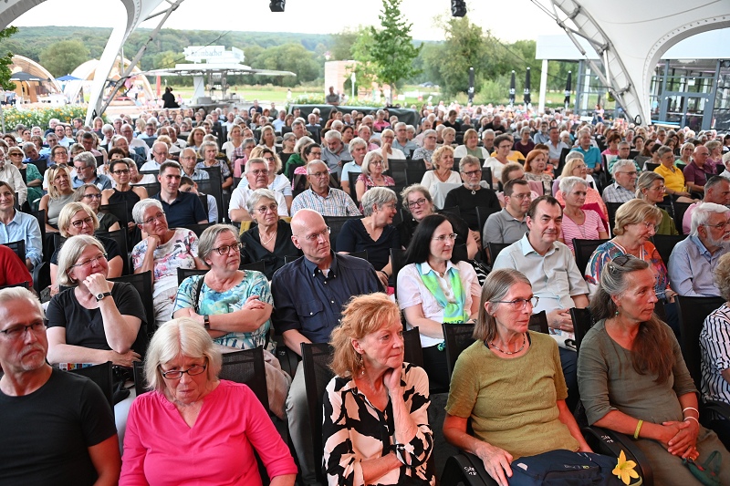 Höxter (TKu). Mit einem sommerlichen Konzert im Rahmen der Landesgartenschau in Höxter wurde den Gästen nicht zu viel versprochen, als im Vorfeld von einem „besonderen sommerlichen Benefizkonzert“ die Rede war. Das international höchst renommierte A-capella-Ensemble „Slixs“ ist auf Einladung des Arbeitskreises der Serviceclubs der Region Höxter-Holzminden am vergangenen Freitag, den 18. August auf der Expert-Bühne der Landesgartenschaugelände im Weserbogen aufgetreten. Etwa 400 Besucherinnen und Besucher waren der Einladung der Serviceclubs gefolgt, um einen unvergesslichen Abend zu erleben. Eingeladen hatte der Ladies´ Circle Höxter-Holzminden, die Lions- und Rotary-Clubs aus Höxter, Holzminden und Warburg sowie der Zonta-Club Höxter. Leonore von Falkenhausen, Präsidentin des Zonta Clubs Höxter und Michael Stolte, Mitglied im Rotary Club Warburg und im Arbeitskreis der Serviceclubs, haben gemeinsam mit den anderen Vertretern und Präsidenten der Serviceclubs diese Veranstaltung eröffnet.