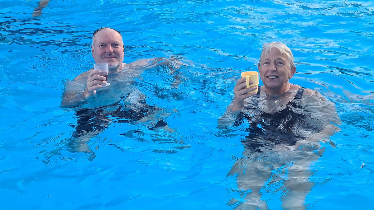 Während des Schwimmens wurde den Teilnehmenden zur Stärkung Tee und Kaffee auf einem schwimmenden Styropor-Tablet serviert. Nach insgesamt 2 Stunden kletterte auch der letzte Schimmer um 21 Uhr aus dem Becken. Anschließend erfolgte noch die Übergabe der Schwimmabzeichen und zur Stärkung gab es für jeden Teilnehmenden ein Vitaminpaket. Bei der Übergabe der Schwimmabzeichen erhielten insgesamt 6 Schwimmer das Abzeichen für 1 Stunde, 5 Schwimmer das Abzeichen für 1,5 Stunden, sowie 13 Schwimmer das Abzeichen für 2 Stunden. Nicht unerwähnt bleiben darf hierbei, dass die 84-jährige Teilnehmerin zu den Schwimmerinnen gehörte, welche das Abzeichen für 2 Stunden erhielt. Abschließend gab es noch einen kurzen, gemütlichen Teil mit netten Gesprächen am Kiosk wo an diesem Abend parallel ein Grill- und Cocktail-Abend stattfand.