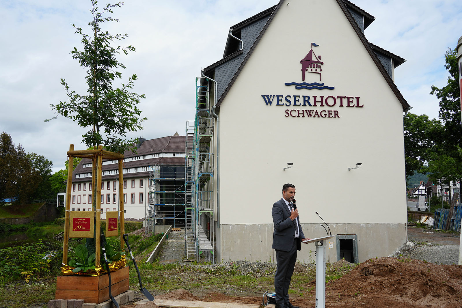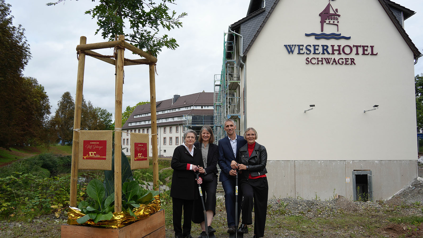 Holzminden (zir). Eine junge Eiche ziert die Kulisse des Weserhotels seit dem Morgen des ersten Septembers. Gepflanzt im Rahmen des 100-jährigen Jubiläums des Kaufhauses Schwager, ehrt die Eiche die Leidenschaft und das Engagement vom Unternehmer Ralf Schwager, der letztes Jahr im Alter von 80 Jahren unerwartet verstarb.
