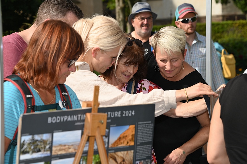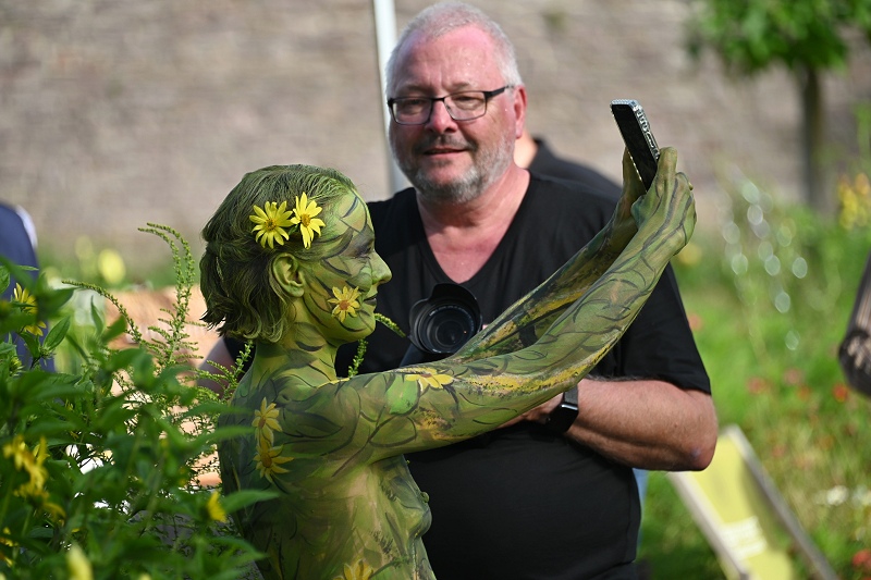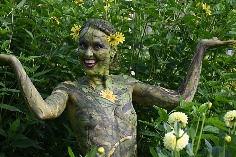 Höxter (TKu). Projekt „Nature Art“ zu Besuch auf der Landesgartenschau in Höxter: Wie Mensch und Natur eins werden können, das veranschaulichte am vergangenen Sonntag der Hamelner Bodypainting-Künstler Jörg Düsterwald im Remtergarten auf der Landesgartenschau. Der Andrang war enorm. Um Modell Carolina, die aus dem Raum Köln stammt, drängten sich viele Fotografen und Landesgartenschau-Besucher, um ein Foto von dem menschlichen Kunstwerk im Staudenbeet mitzunehmen. Damit sie auf kunstvolle Weise mit der Natur eins wird, posierte das 27-jährige Fotomodell bemalt im Staudenbeet zusammen mit der gelben „Sonnenbraut“. Sie selbst war in den gleichen Farben wie die Staudenpflanze bemalt und passte sich in eine Lücke der Staudenpflanze ein. Bereits um 11 Uhr hatte Jörg Düsterwald damit begonnen, sein Modell mit abwaschbarer und hautverträglicher Körperfarbe zu bemalten. Sechs Stunden später konnte das Ergebnis bewundert werden. „Nein, das kitzelt nicht bei der Bemalung“, musste Carolina oft antworten, weil immer wieder die Frage dazu seitens der Besucherinnen und Besucher gestellt wurde.
