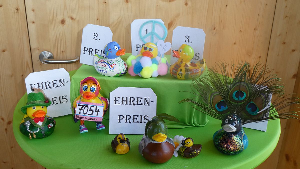 Obwohl es aufgrund der kreativen Ausführungen nicht einfach war, stellte sich zum Schluss die Friedensente als Sieger heraus. Nicht weniger originell ist der 2. Platz mit der Landesgartenschau und Straßentheater-Ente besetzt. Den 3. Platz vergab die Jury an die Ente mit aufwendig hergestellten Holzminden und Höxter-Wahrzeichen. Ehrenpreise erhielten die Schützenente, die Läufer-Ente, eine Ente mit zwei Küken sowie die Pfauenente. Die Gewinner erhalten 200, 100 und 50 Euro, während die Ehrenpreise jeweils mit 20 Euro ausgezeichnet werden. Die Preise werden im Rahmen einer kleinen Siegerehrung am Rande des Entenrennens übergeben oder können entweder im Bürgerbüro Höxter beziehungsweise beim Stadtmarketing Holzminden abgeholt werden.