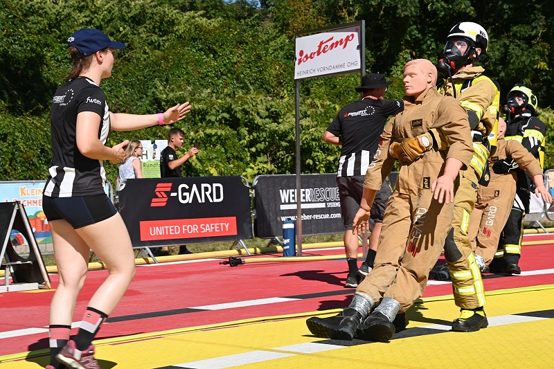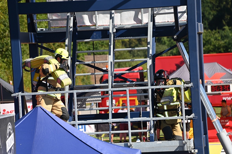 Höxter (TKu). Was für ein heiße Challenge bei mehr als 30 Grad Celsius: In Höxter findet am Samstag und Sonntag die Europameisterschaft „European FireFit“ auf der Landesgartenschau statt. Hierbei messen sich die fittesten Feuerwehrfrauen und -männer in Disziplinen, die Kraft, Ausdauer und Koordination erfordern. Nach den Qualifikationsläufen am Donnerstag und Freitag findet die eigentliche Europameisterschaft am Samstag in der Einzel- und am Sonntag in der Teamwertung statt. Daran nehmen etwa 200 Feuerwehrleute aus Deutschland, Litauen, Polen, England und sogar aus Amerika teil. Nur die etwa 120 Besten werden zu den Einzelläufen am Samstag zugelassen. Bei der FifeFit Challenge laufen die Feuerwehrleute zuerst unter voller Schutzausrüstung, mit angeschlossenem Atemschutzgerät auf dem Rücken und mit einem 19 Kilogramm schweren Schlauchpaket auf ihrer Schulter den 12 Meter hohen HAIX-Tower nach oben, ziehen mit aller Kraft eine Schlauchrolle den Turm hinauf und verlassen den Turm wieder nach unten, wo es eine Hammerschlagmaschine zu bewältigen gilt. Danach sprinten sie durch den Slalomparcours, greifen danach einen Schlauch, ziehen ihn nach vorne und löschen einen Brand. Unter der Motivation der Schiedsrichter heißt es abschließend, einen 85 Kilogramm schweren menschlichen Dummy im Rettungsgriff auf einer 30 Meter langen Strecke ins Ziel zu schleppen.