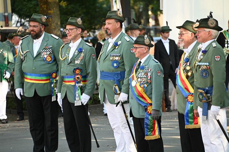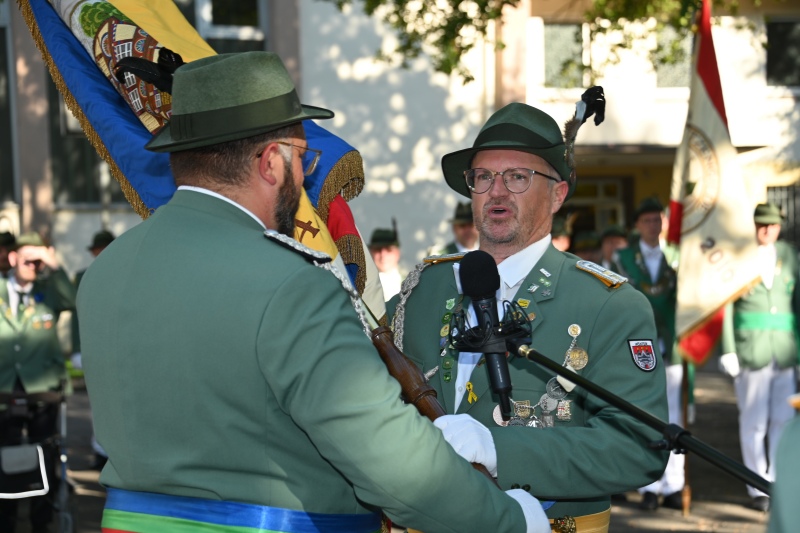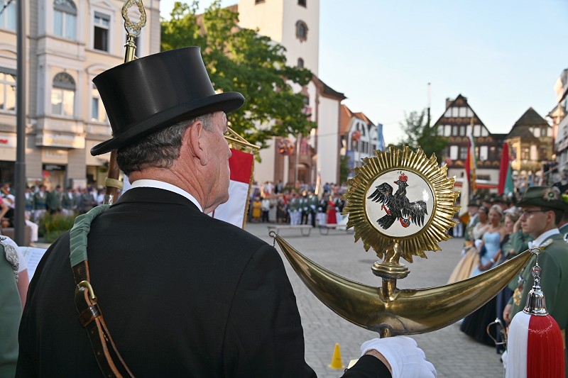 Als Jubiläums-Festredner auf der Bühne sprach neben dem Landrat Michael Stickeln und Bürgermeister Daniel Hartmann auch ein besonderer Bürger der Stadt Höxter zu den Menschen: Höxters Ehrenbürger Professor Dr. Klaus Töpfer, der in seinem langen politischen Leben die ganze Welt gesehen hat, liegt seine Heimatstadt Höxter allerdings am meisten am Herzen. Aus diesem Grund hat er seit seiner Rückkehr nach Höxter seinen Lebensmittelpunkt wieder in Höxter gefunden. „Es ist großartig, durch die Stadt zu gehen, wo man die Menschen kennt!“ Mit diesem Satz begann Klaus Töpfer seine freie Festrede, in der er eine Hommage an seine Heimatstadt Höxter aussprach. Von 21 Abiturienten seines Jahrgangs sei nur er wieder nach Höxter zurückgekehrt. „Jeder Tag, den man länger hier lebt, ist diese Entscheidung richtig gewesen“, sagte der 85-jährige ehemalige Bundes-Umweltminister und Vertreter wichtiger weltweiter Gremien in seiner emotionalen Rede. Das Jubiläumsfest war eng verknüpft mit dem alle zwei Jahre stattfindenden Sommerfest der Schützengilde Höxter von 1595 e.V., die den Bärenanteil an Umzugsteilnehmern gestellt hat. Bürgermeister Daniel Hartmann zeigte sich erfreut, dass die Stadt Höxter bei der Umsetzung der Jubiläumsfeierlichkeiten die Schützengilde Höxter als einen wichtigen Partner an der Seite der Stadt Höxter hatte. Die Gilde selbst verfügt über eine sehr lange Tradition, die mit der Stadt Höxter eng verbunden ist.