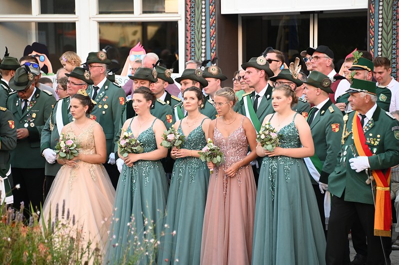 Höxter (TKu). „Schön, dass Sie alle da sind!“, freute sich Bürgermeister Daniel Hartmann, der mit diesen Worten alle Umzugsteilnehmer und Bürgerinnen und Bürger auf dem Markt willkommen hieß. Das Schützenmotto „Die ganze Bürgerschaft soll es sein“, spiegele sich an diesem besonderen Festtag wider, so Hartmann. Es kamen Hunderte bei schönstem Sommerwetter und es war ein langer Festumzug aus Vereinen und Gästen mit mehr als 1000 Umzugsteilnehmern, der am Samstagabend vor der Bühne in der Marktstraße und auf dem Marktplatz Aufstellung nahm anlässlich des 1200-jährigen Jubiläums der Stadt Höxter. Getreu dem Motto der Höxteraner Schützengilde „Die ganze Bürgerschaft soll es sein“, waren hunderte Schützen, Königs- und Hofstaatpaare der Stadt und der Ortschaften, Höxteraner Vereine, Institutionen, Gäste aus Politik, Verwaltung und Wirtschaft sowie Bürgerinnen und Bürger am Samstagabend zum Marktplatz gekommen, um das 1200-jährige Jubiläum der Kreisstadt gebührend zu feiern.