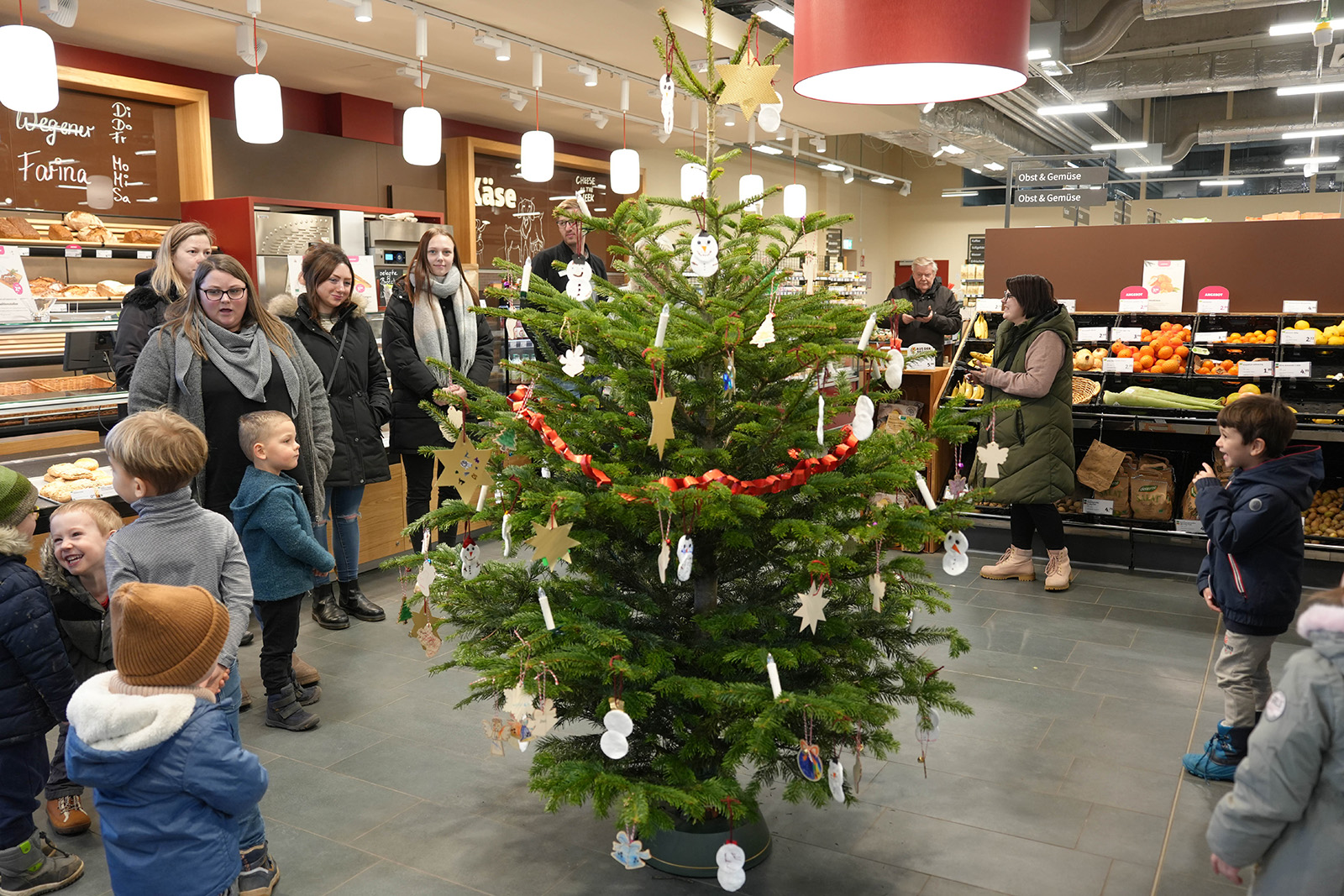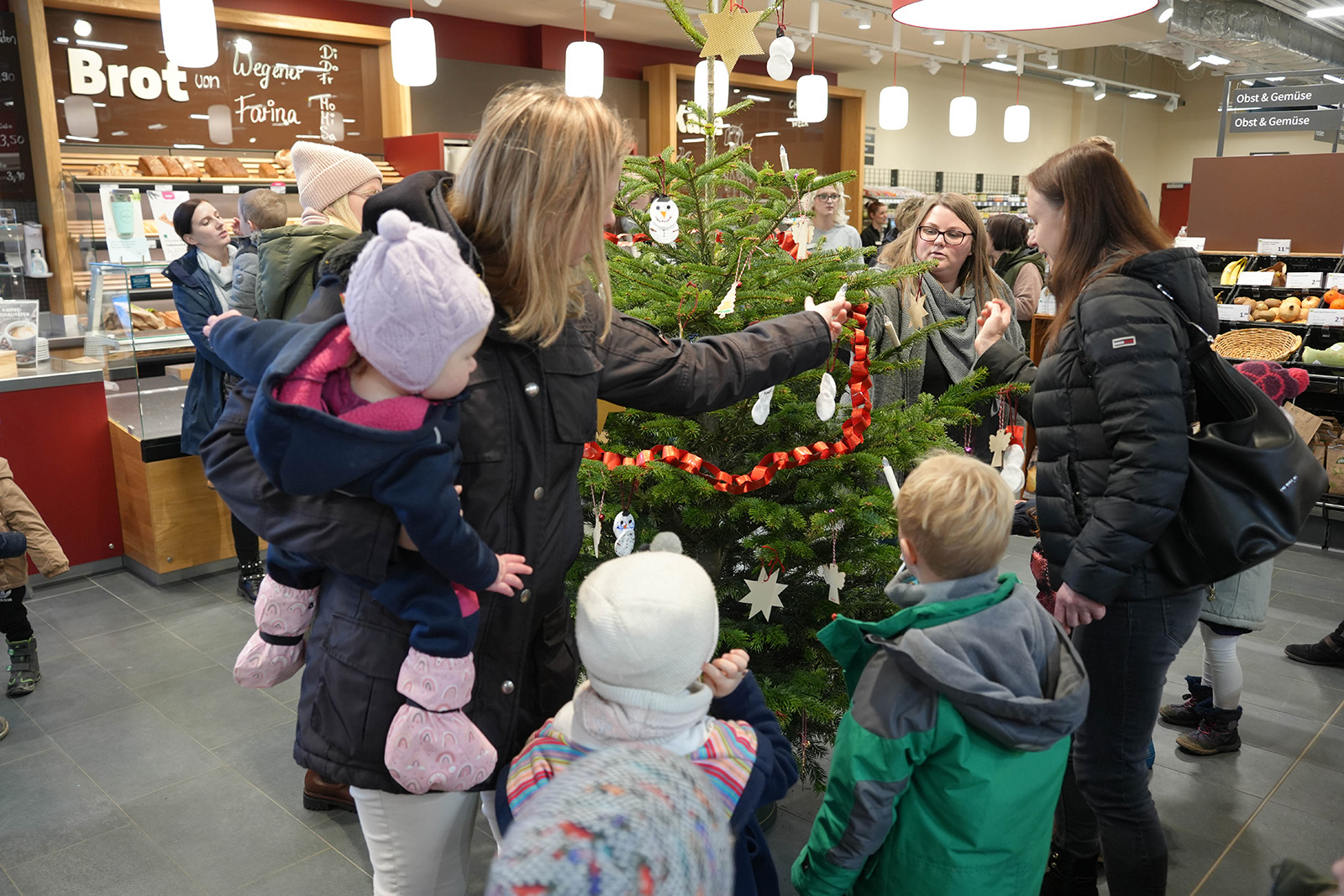 Holzminden (zir). Betritt man nun den Laden denn’s Biomarkt, fällt einem direkt ein schön dekorierter Weihnachtsbaum auf. Im Zuge einer Aktion des Marktes unter der Leitung von Marktleiter Nils Nehrig und stellvertretende Marktleiterin Anne-Kathrin Raulfs schmückten die Kinder der ev. luth. Kita St. Pauli am 7. Dezember den Weihnachtsbaum, den man inmitten der Obst- und Gemüseabteilung bewundern kann. Hierfür bastelten die Kinder unter der Leitung des St. Pauli Teams verschiedene Dekorationen, die den Baum zu einem einzigartigen Anblick werden ließen. Mit zwei Wattepads, Wackelaugen und einem Hut sowie einer Nase aus Bastelpapier entstand so zum Beispiel ein Weihnachtsmann. Wo die Dekorationen hängen sollten, entschieden die kleinen Künstler selbst.